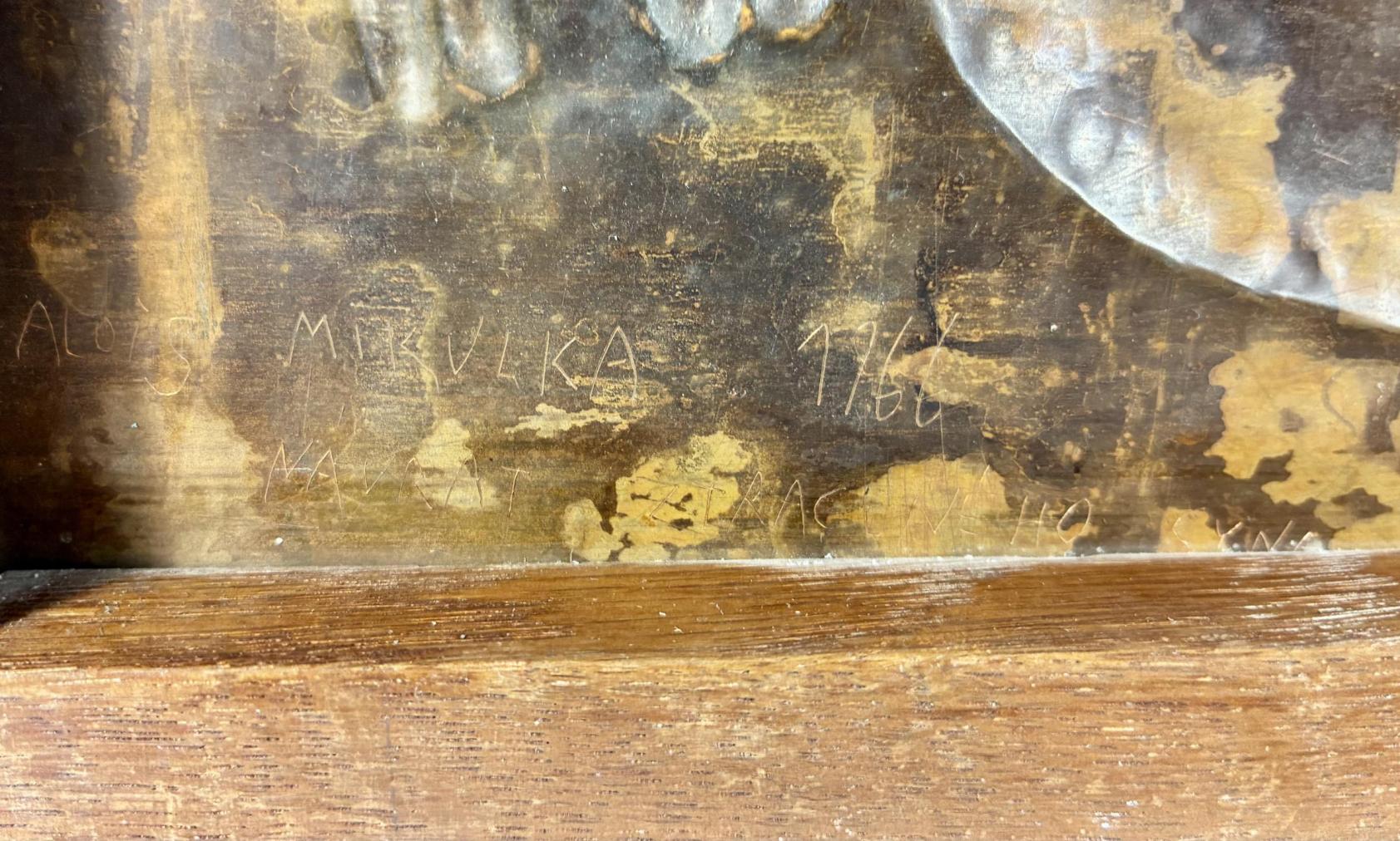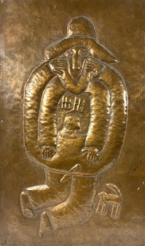 Plastický obraz připevněný na dřevěném rámu od Aloise Mikulky. Měděný tepaný plát vyobrazující scénu s názvem: Návrat ztraceného syna II. Rozměry díla jsou 22 x 38 cm. Celkové rozměry s rámem jsou 40 x 24,5 cm. Signováno ze zadní strany: Alois Mikulka, 1966.
