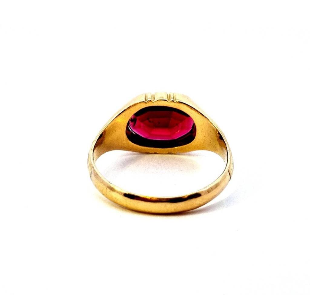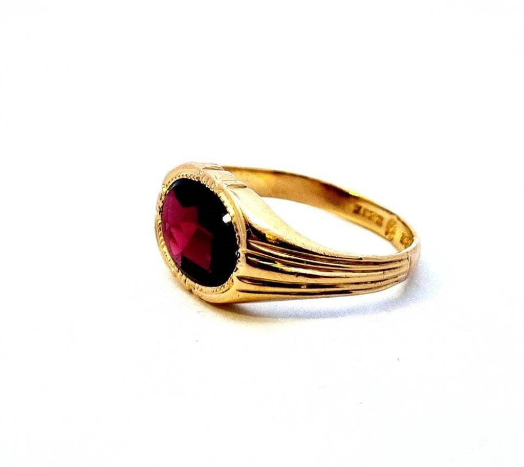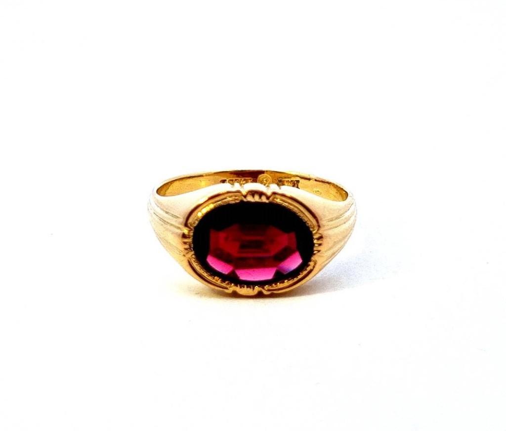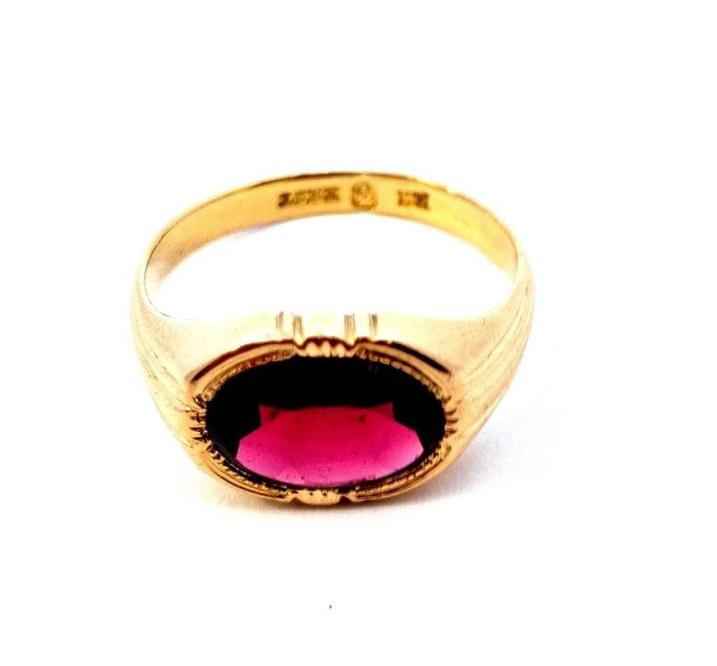 Zlatý prsten o ryzosti 585/1000, punc labuť. Velikost 66, váha 8,21 g, v nejširším bodě 12 mm. Kámen je syntetický.