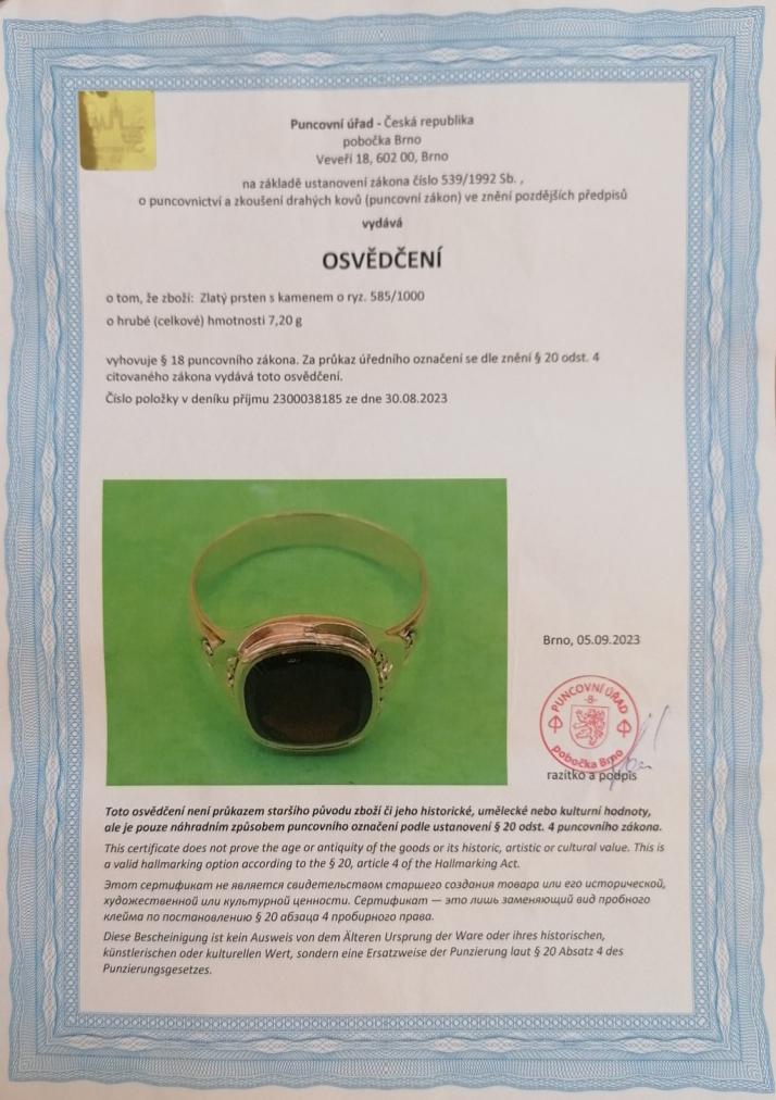 Zlatý prsten o ryzosti 585/1000, osvědčení z Puncovního úřadu. Velikost 66, váha 7,20 g, šířka v nejširším bodě 9 mm.