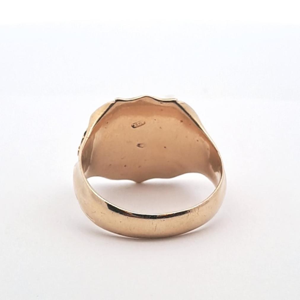 Zlatý prsten, vel. 63, ryzost 585/1000, punc liška. Váha 11,28 g, šířka v nejširším bodě 17,5 mm.