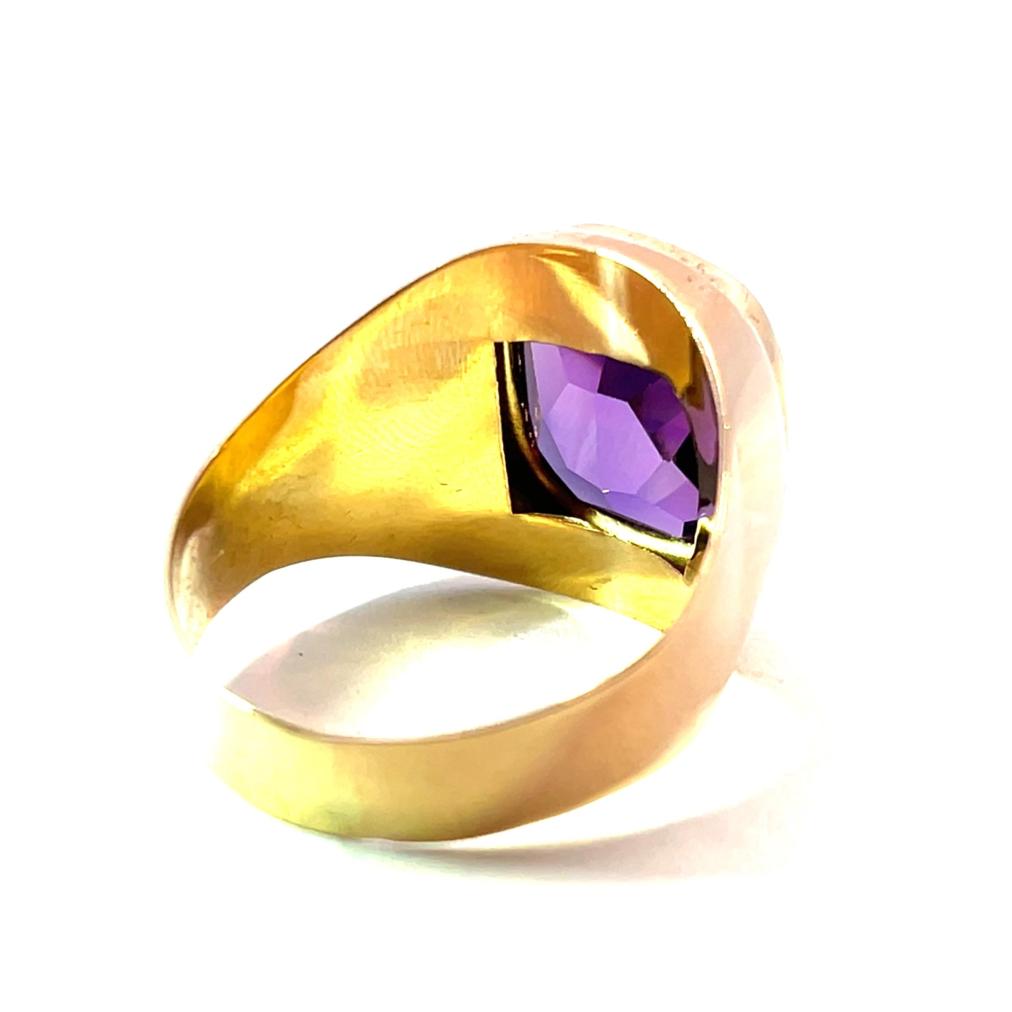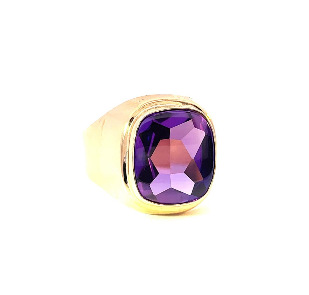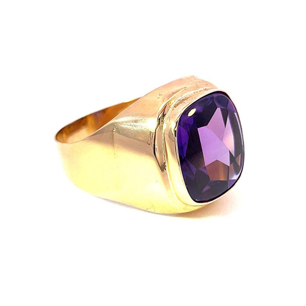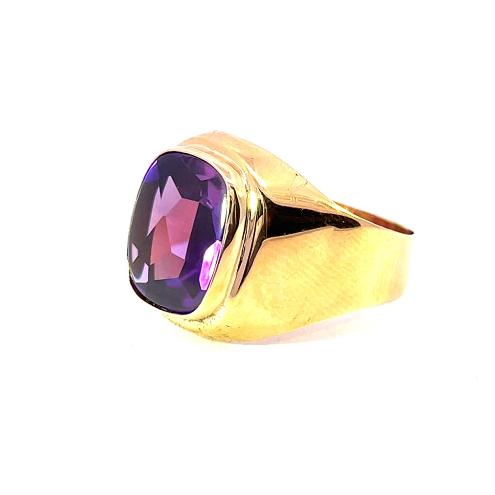Prsten z růžového zlata o ryzosti 585/1000, punc klas. Velikost 72, váha 7,91 g, v nejširším bodě 20,5 mm, rozměr kamene 16,5 x 15 mm. Kámen je syntetický.