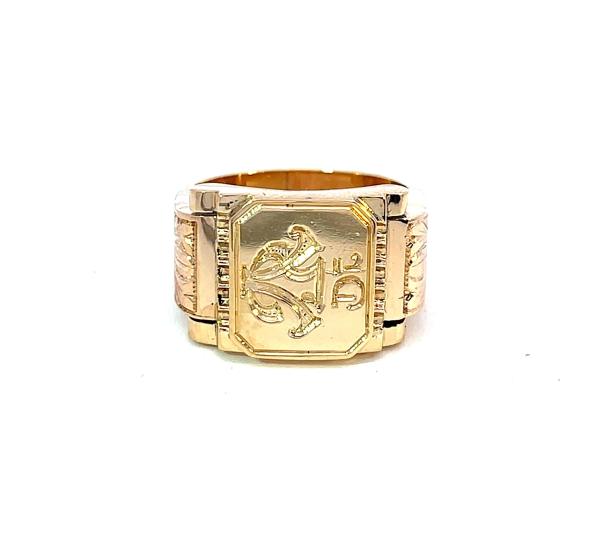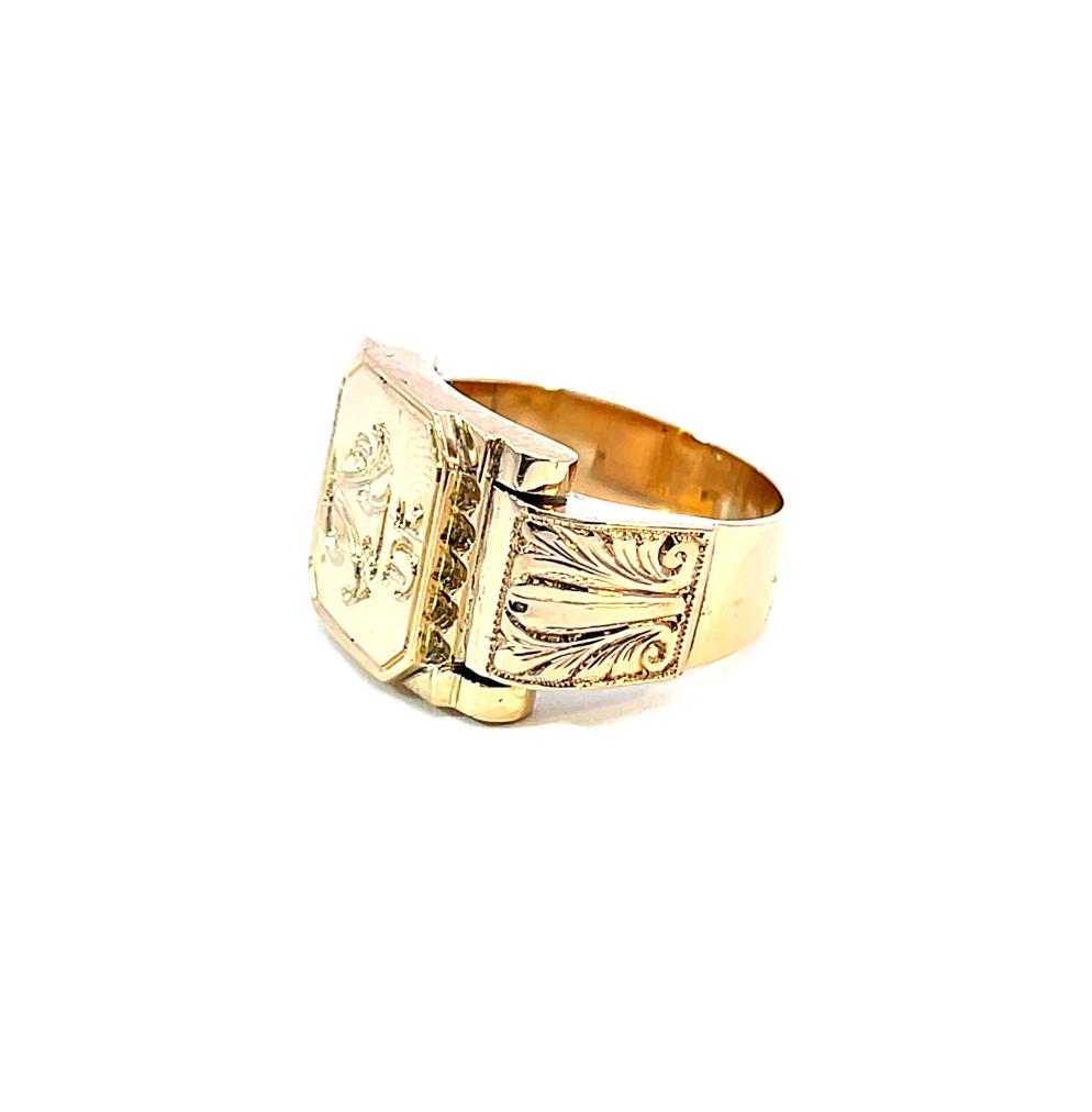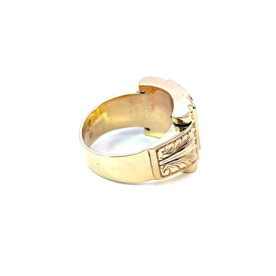 Zlatý prsten o ryzosti 585/1000, punc klas. Velikost 60, váha 12,83 g, v nejširším bodě 15 mm.