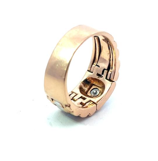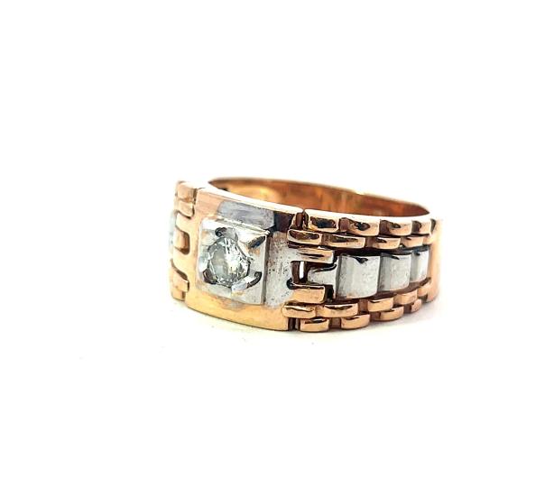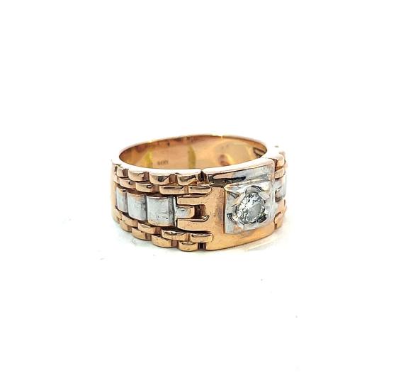 Prsten z kombinace růžového a bílého zlata o ryzosti 585/1000, punc labuť. Váha 16,03 g, velikost 67, v nejširším bodě 11 mm. Kámen - přírodní diamant briliantového brusu - 1 ks, cca 0,20 ct.