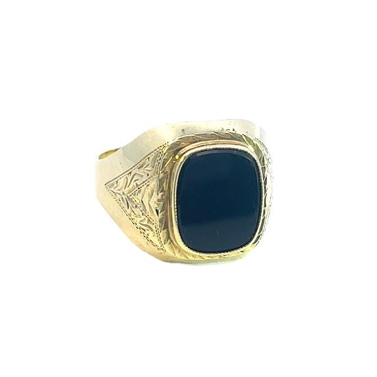 Pánský prsten ze zlata o ryzosti 585/1000 s puncem čejka, zdobený černým kamenem a rytinou. Velikost prstene je 68. Váha 6,55 g. Rozměry černého kamene jsou 12 x 10 mm. Přední strana prstenu má rozměry cca 17 x 19 cm. Kámen je syntetický.