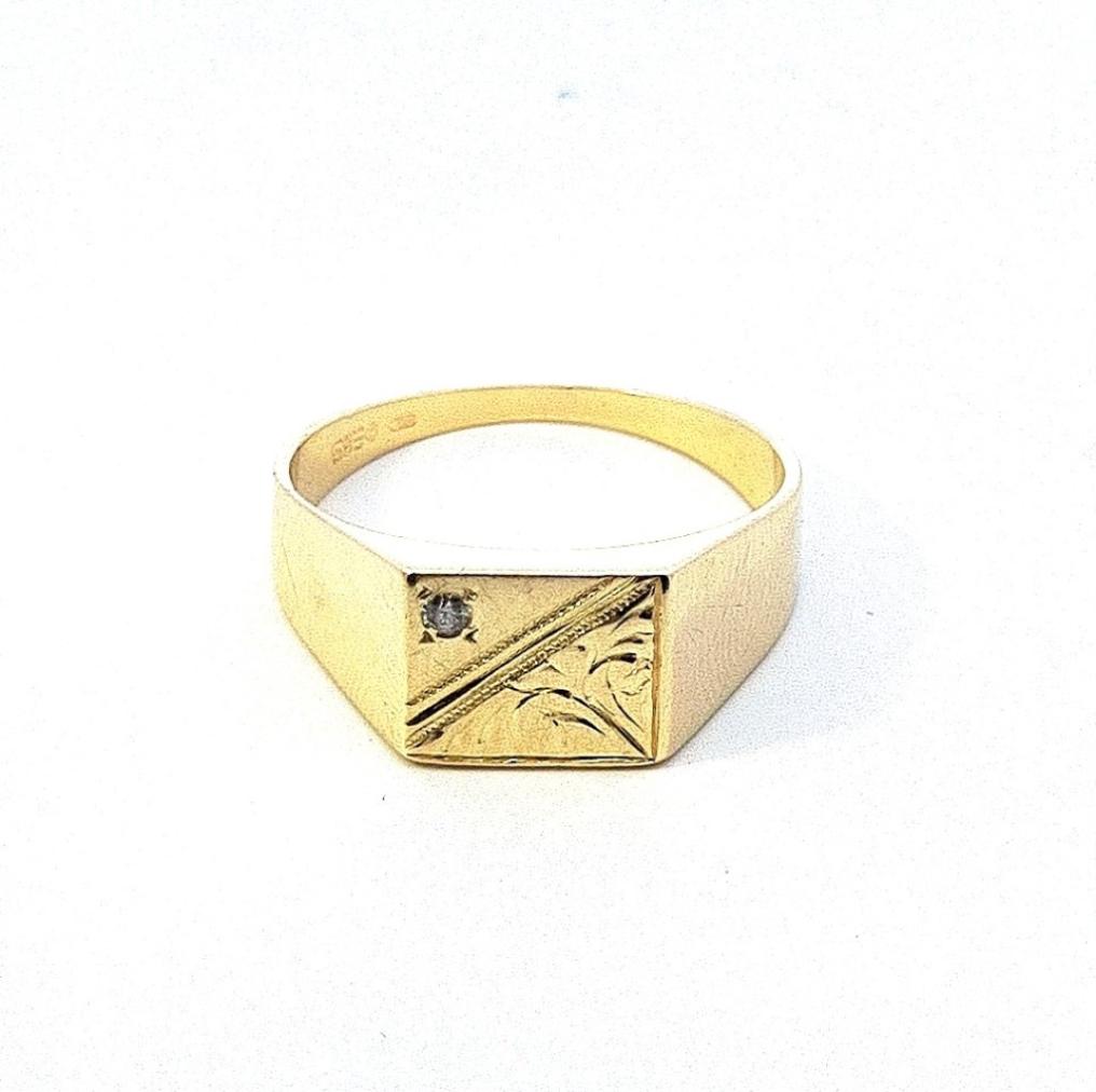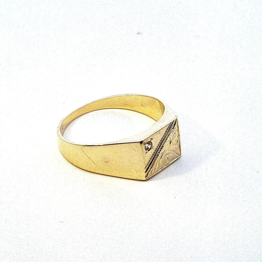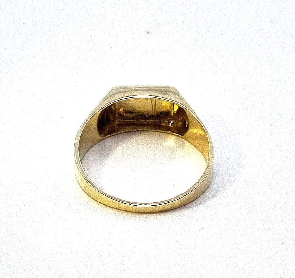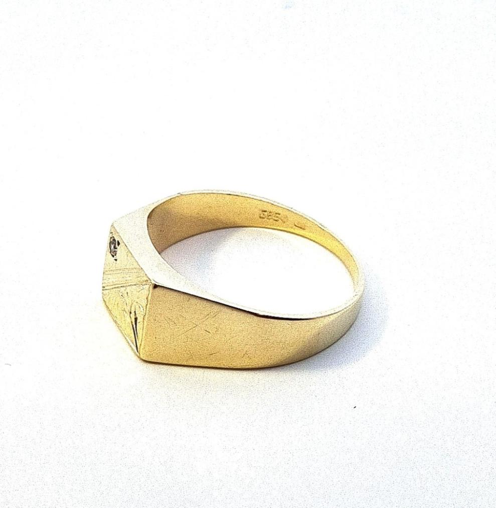Zlatý prsten o ryzosti 585/1000, punc labuť , váha 5,30 g, velikost 67, v nejširším bodě 9 mm.