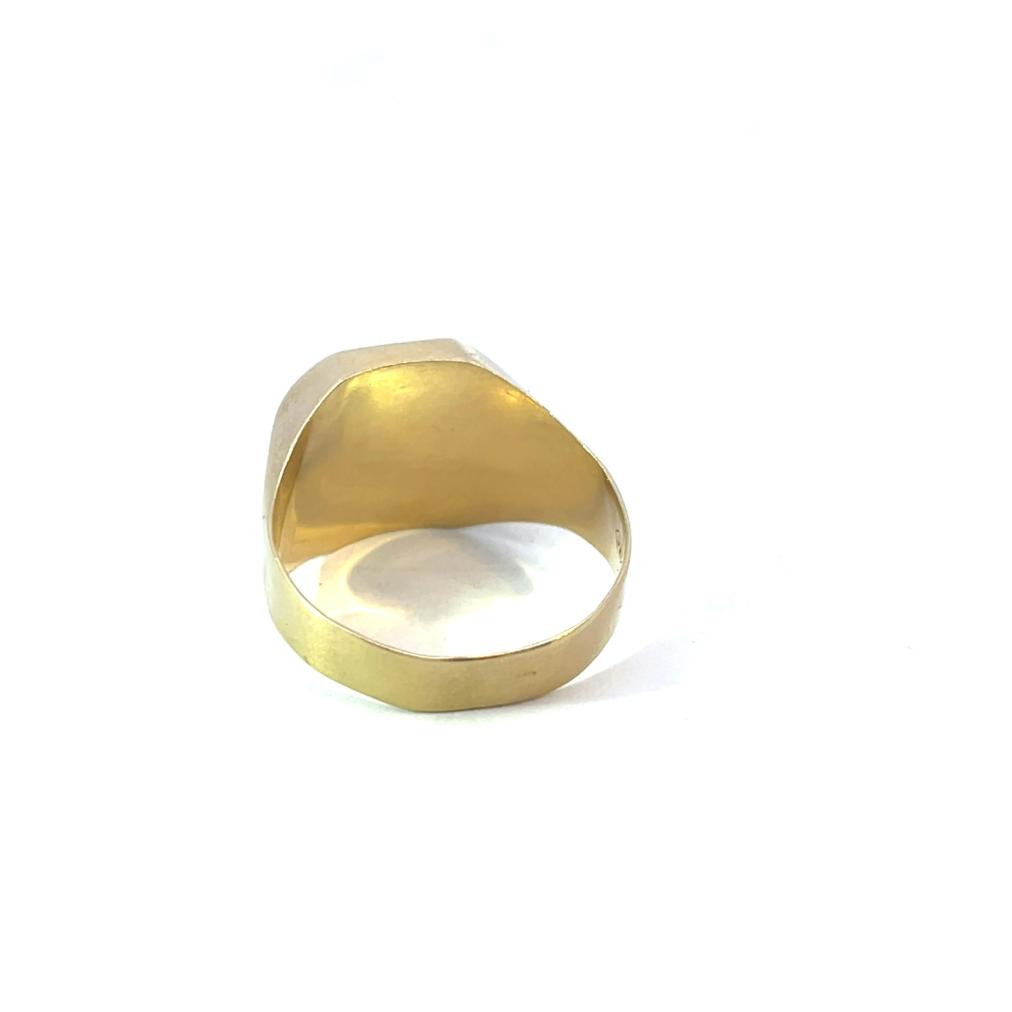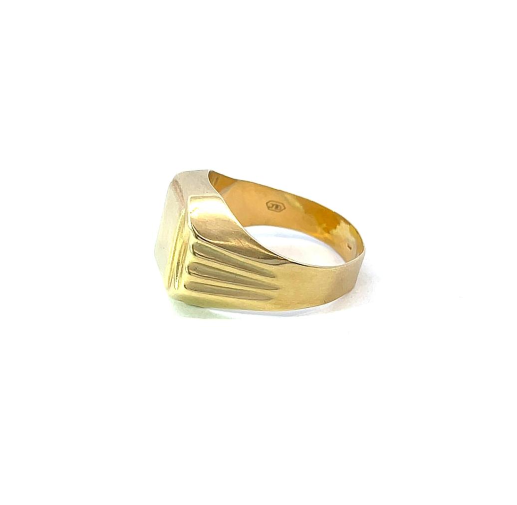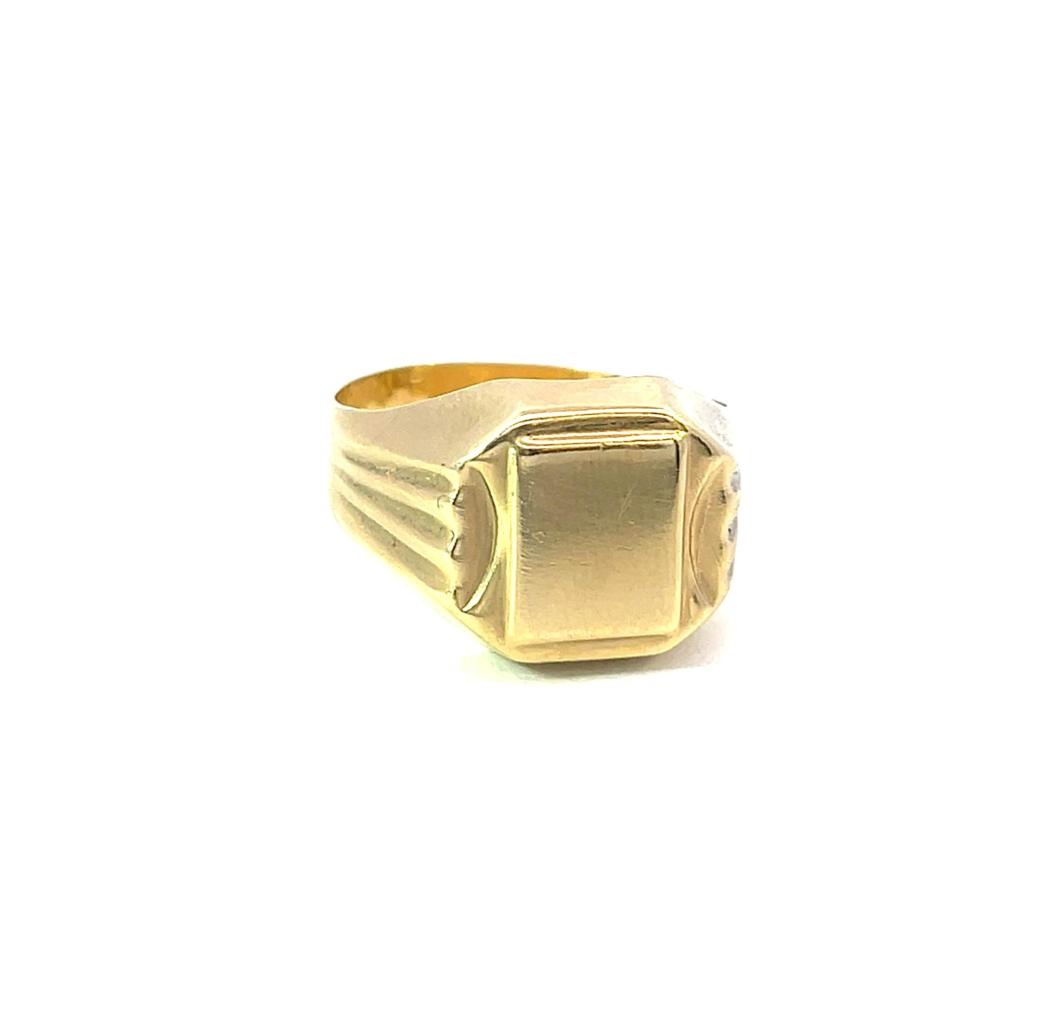 Zlatý prsten o ryzosti 585/1000, punc labuť. Velikost 64, váha 3,15 g, rozměr hlavy prstenu 14,5 x 14,5 mm. Šína je lehce deformovaná, viz foto.