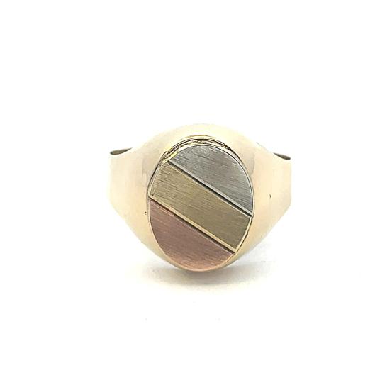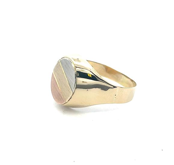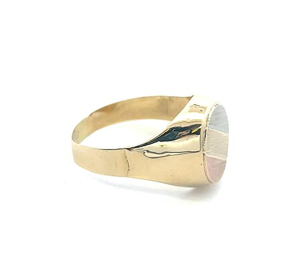 Zlatý pánský prsten o ryzosti 585/1000 s puncem labuť. Velikost prstenu 73. Váha 6,04 g. Rozměry hlavy prstenu jsou 17 x 12 mm. Hlava prstenu je zdobena matnými plochami z růžového, žlutého a bílého zlata.