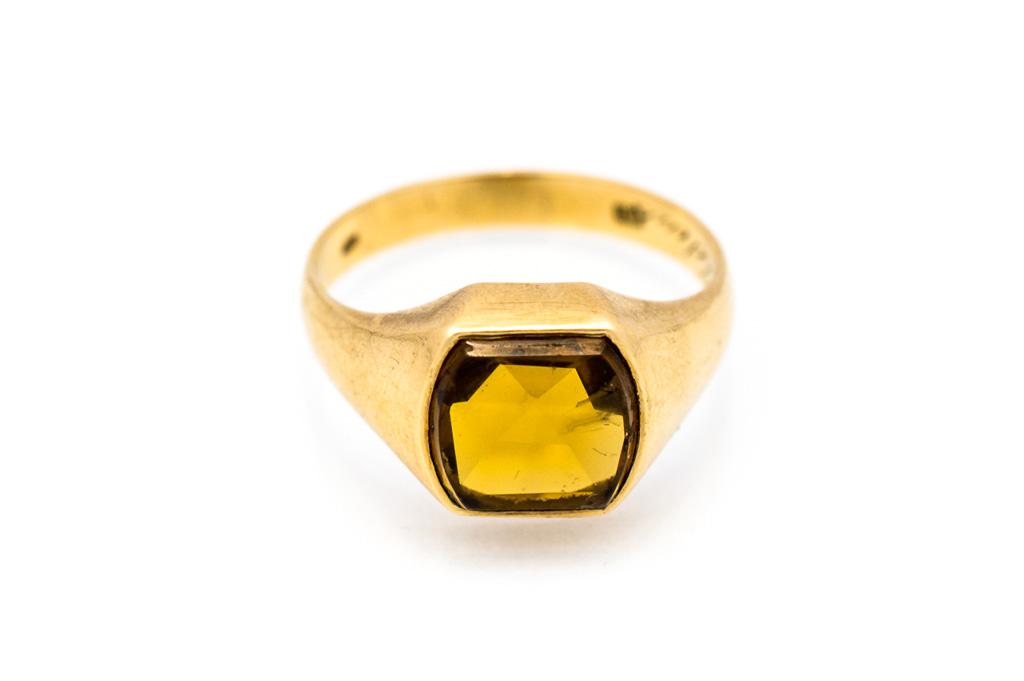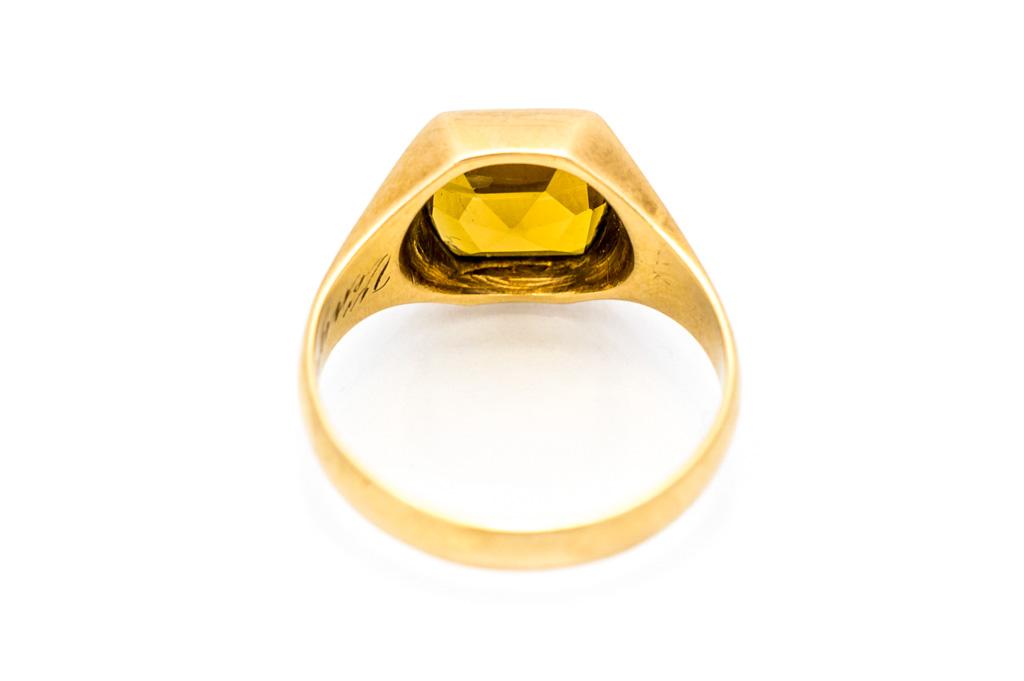 Prsten ze žlutého zlata o ryzosti 585/1000, váha 6,12 g, velikost 59. Kámen má v rožku miniaturní oťuk.