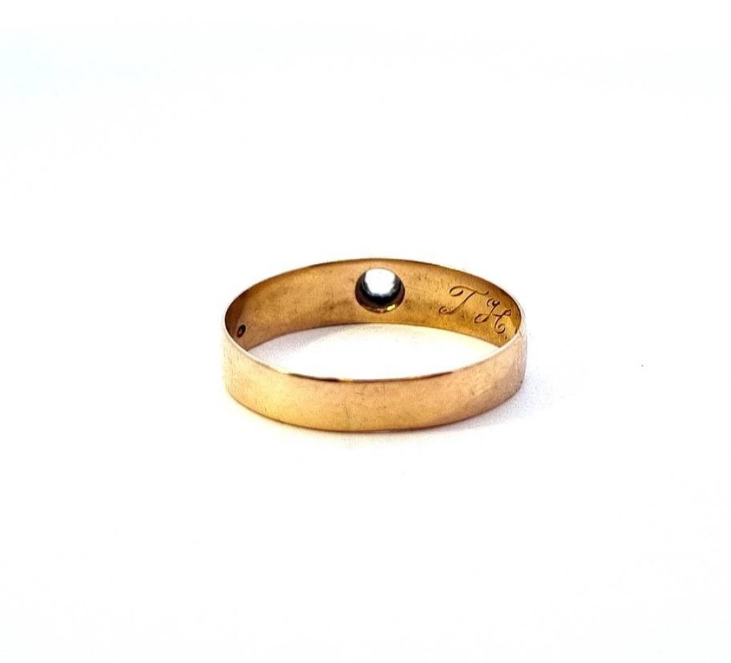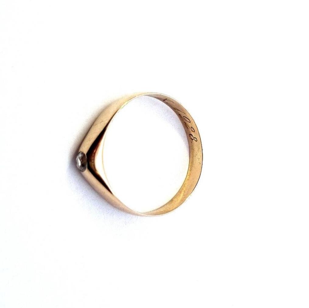 Zlatý prsten o ryzosti 585/1000, punc čejka. Velikost 63, váha 2,93 g, v nejširším bodě 5,5 mm.