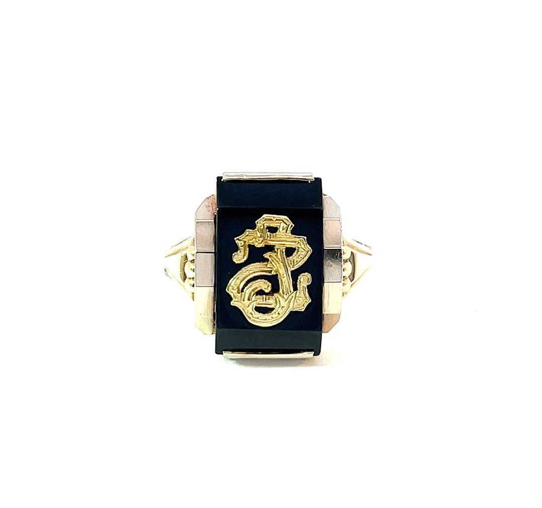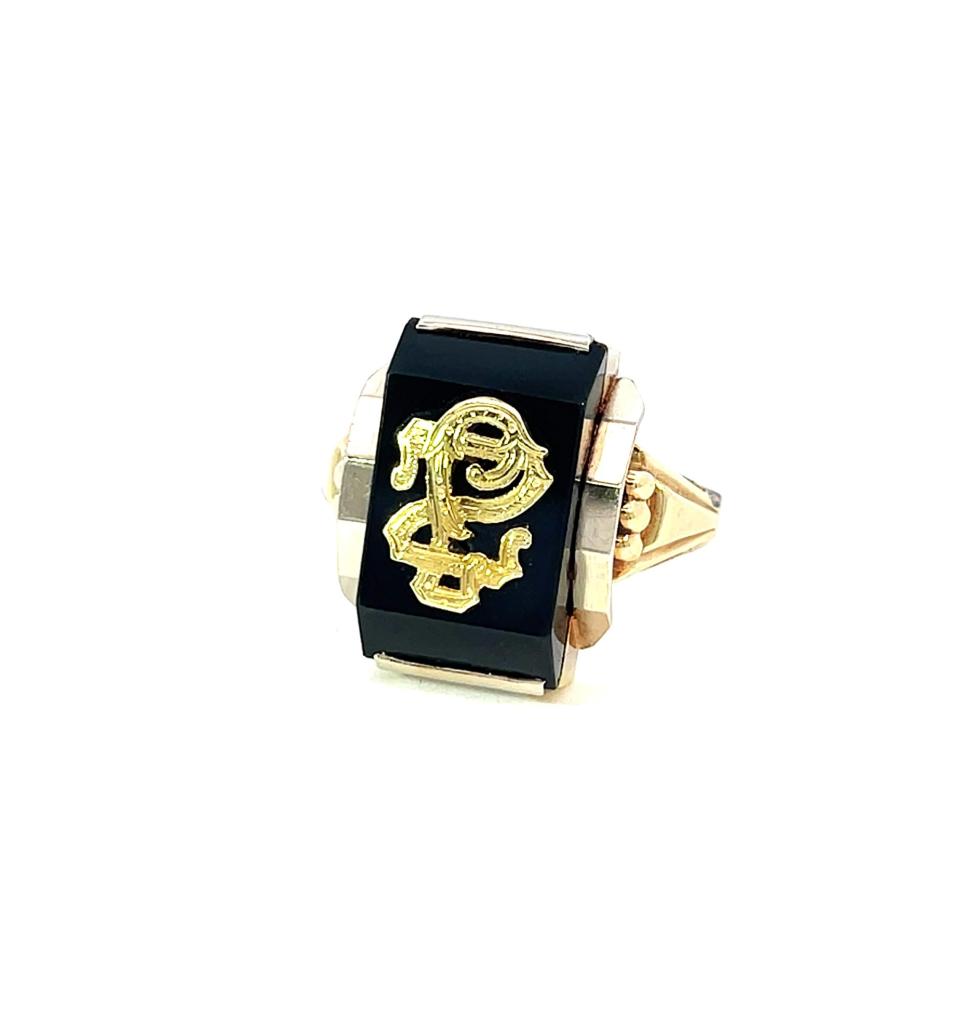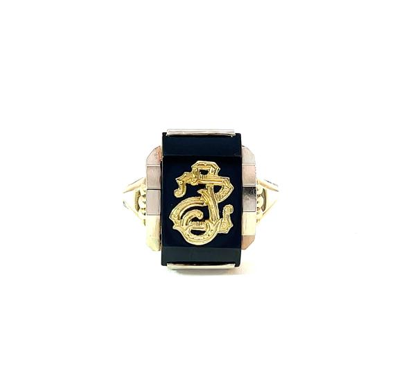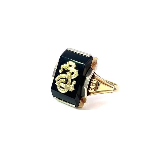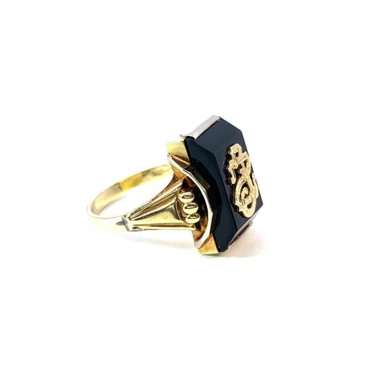 Zlatý prsten s onyxem a monogramem, vel. 59