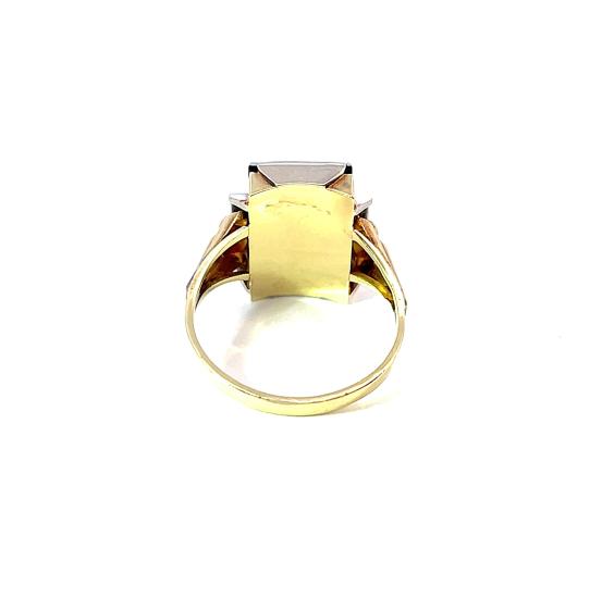 Prsten z kombinace žlutého a bílého zlata o ryzosti 585/1000, punc labuť. Váha 5,82 g, velikost 59, rozměr hlavy prstenu 18 x 14 mm. Kámen lehce kloktá.
