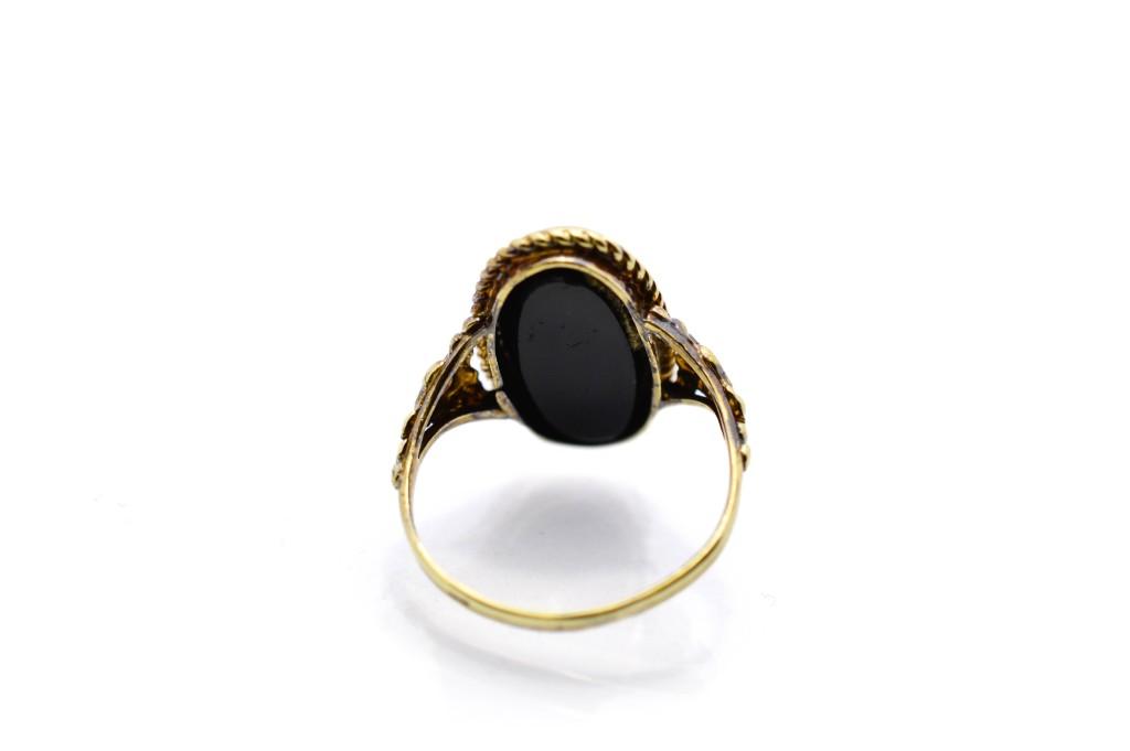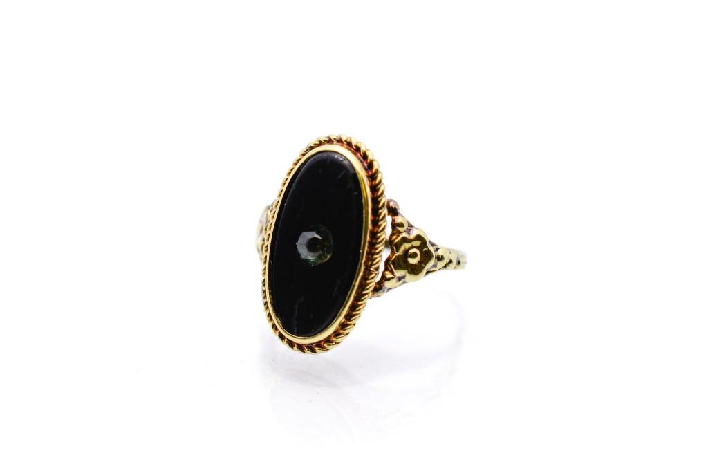 Zlatý prsten s onyxem, vel. 50. Ryzost 585/1000, punc labuť. Váha 2,43 g. Rozměr kamene 15 x 8 mm. V onyxu je zasazen zirkon.
