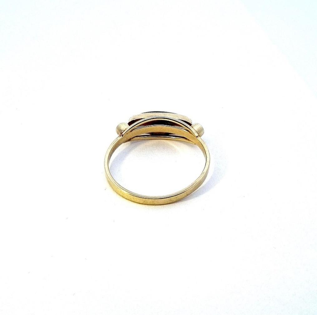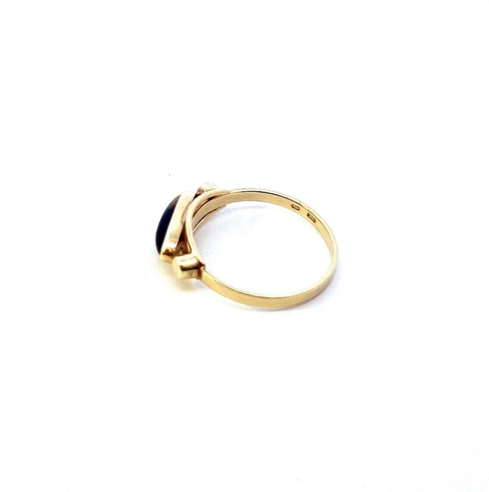 Zlatý prsten o ryzosti 585/1000, punc labuť. Velikost 60,5, váha 2,96 g, šířka v nejširším bodě 7 mm, rozměry kamene 14 x 4 mm.