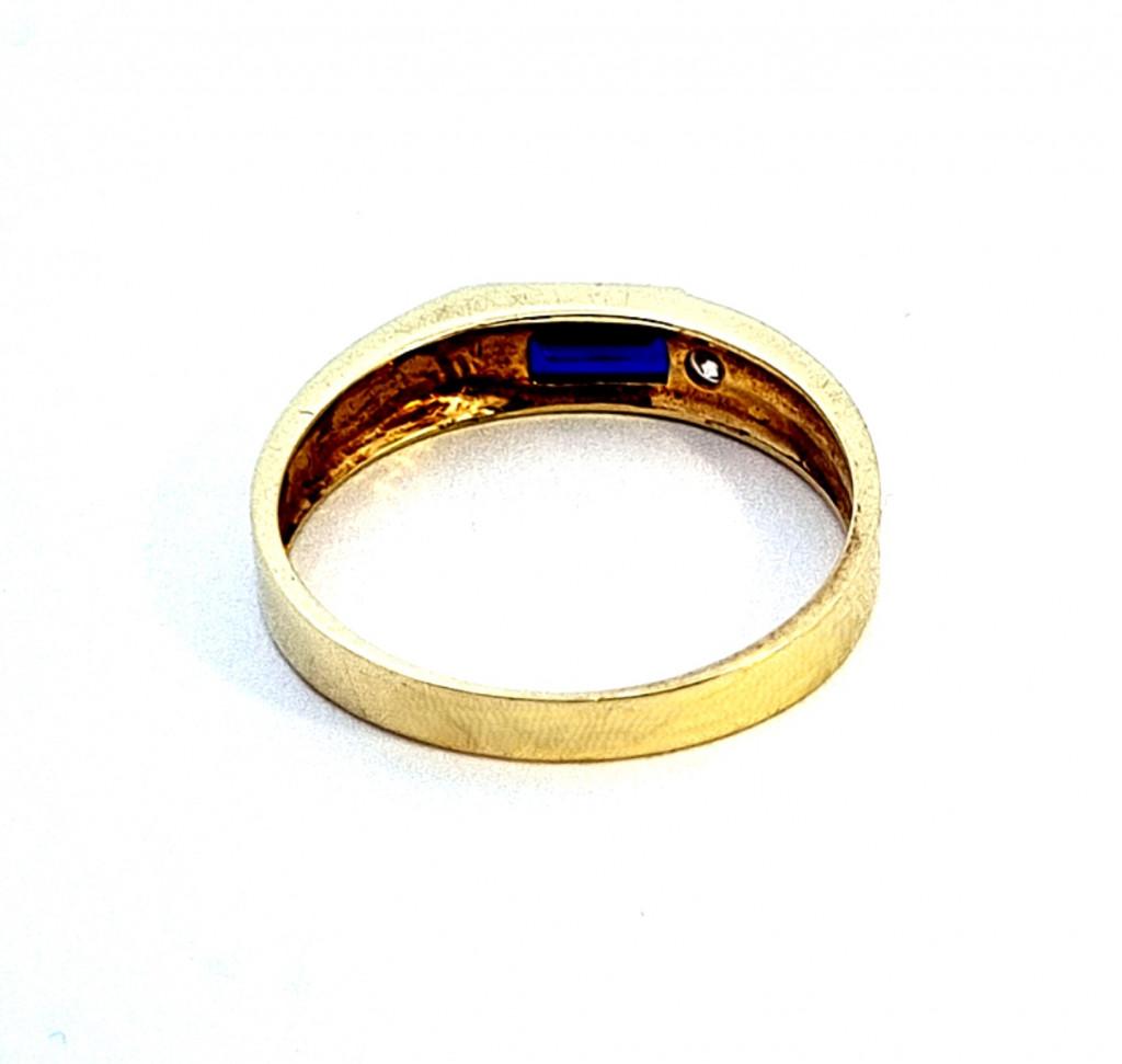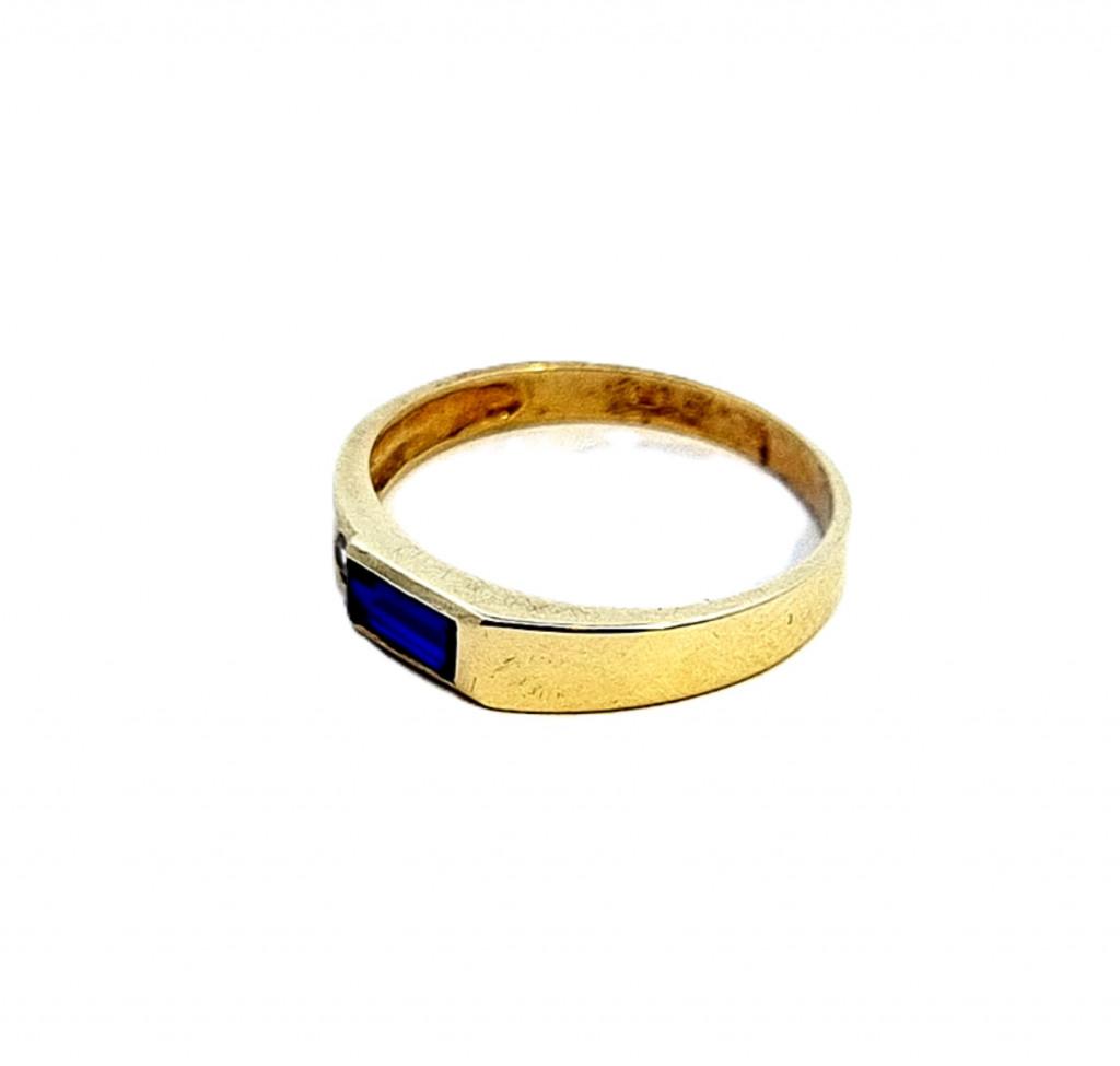 Zlatý prsten o ryzosti 585/1000, punc labuť. Velikost 56, váha 2,48 g, v nejširším bodě 4 mm. Kameny jsou syntetické.