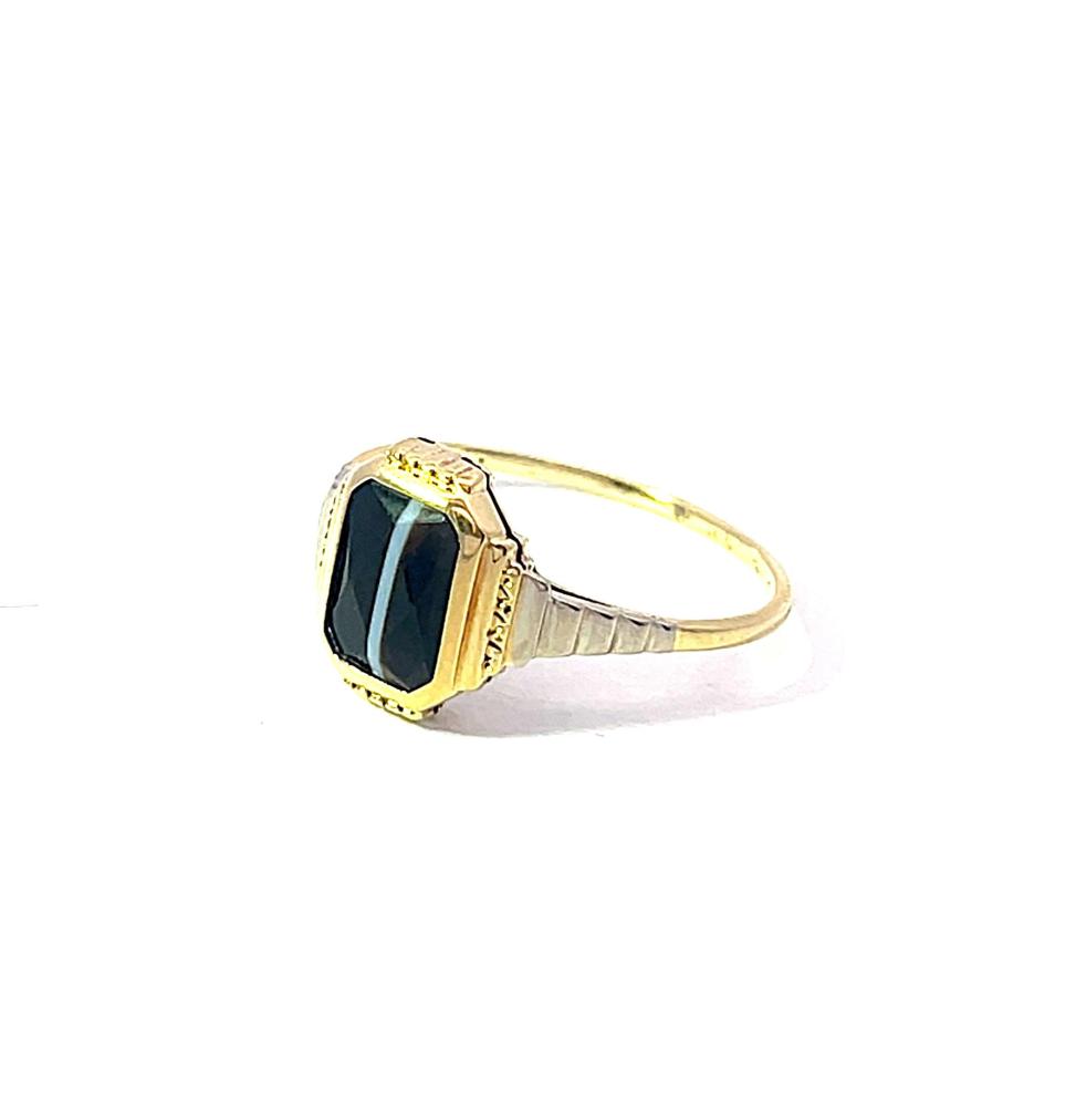 Elegantní starožitný zlatý prsten ze žlutého a bílého zlata s tmavým kamenem, který protíná bílý pruh. Zlato o ryzosti 585/1000, punc lvíček. Váha 2,02 g, velikost 57. Rozměry hlavy prstenu jsou 12 x 12 mm. Velikost kamene je 8 x 6 mm. Šířka šiny je 1 mm.