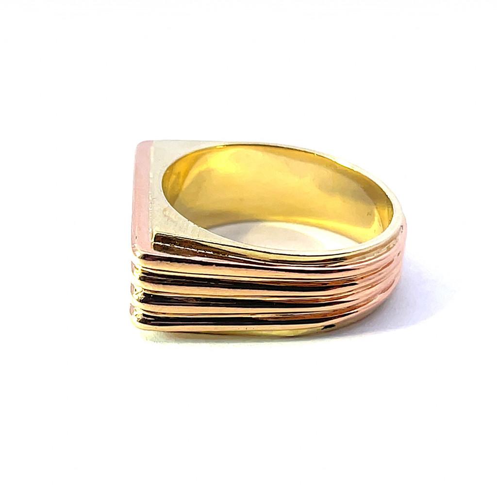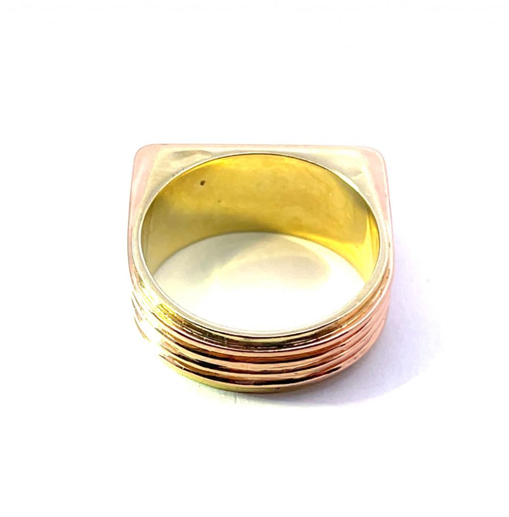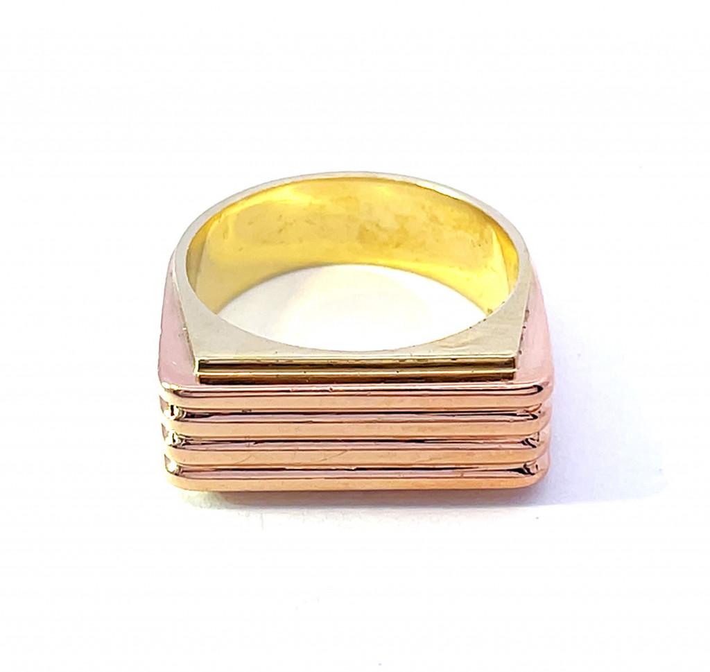 Zlatý prsten z kombinace žlutého a růžového zlata o ryzosti 585/1000, punc lvíček. Velikost 60, váha 8,21 g, v nejširším bodě 9,5 mm.