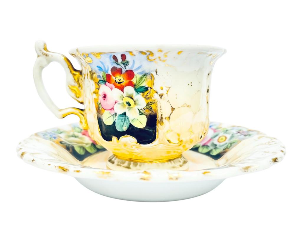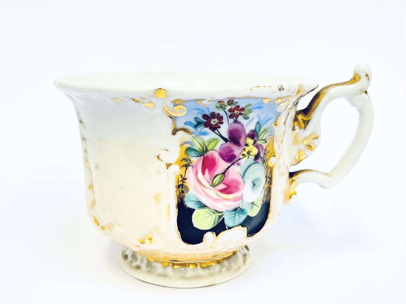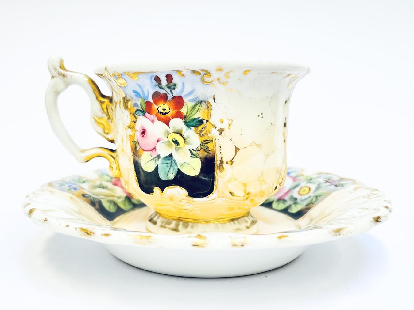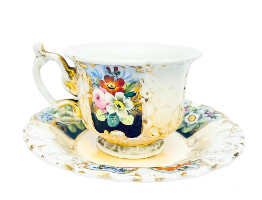Výška šálku 7 cm, průměr hrdla šálku 9 cm, výška podšálku 3 cm, průměr podšálku 15 cm. Značeno písmenem A.