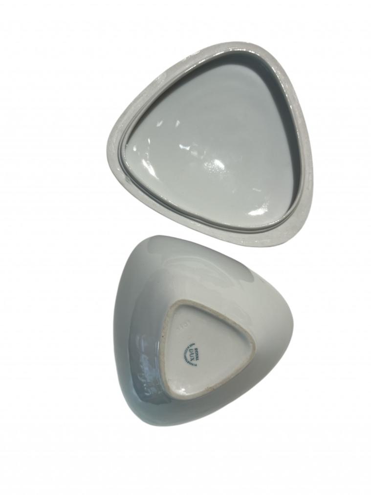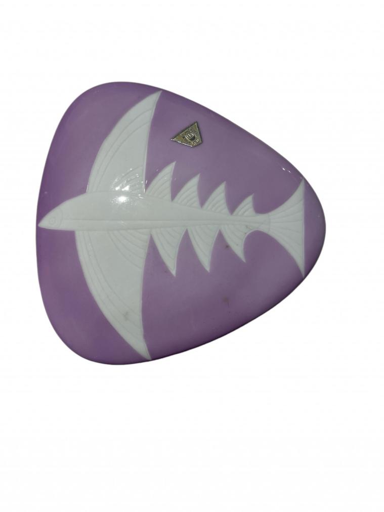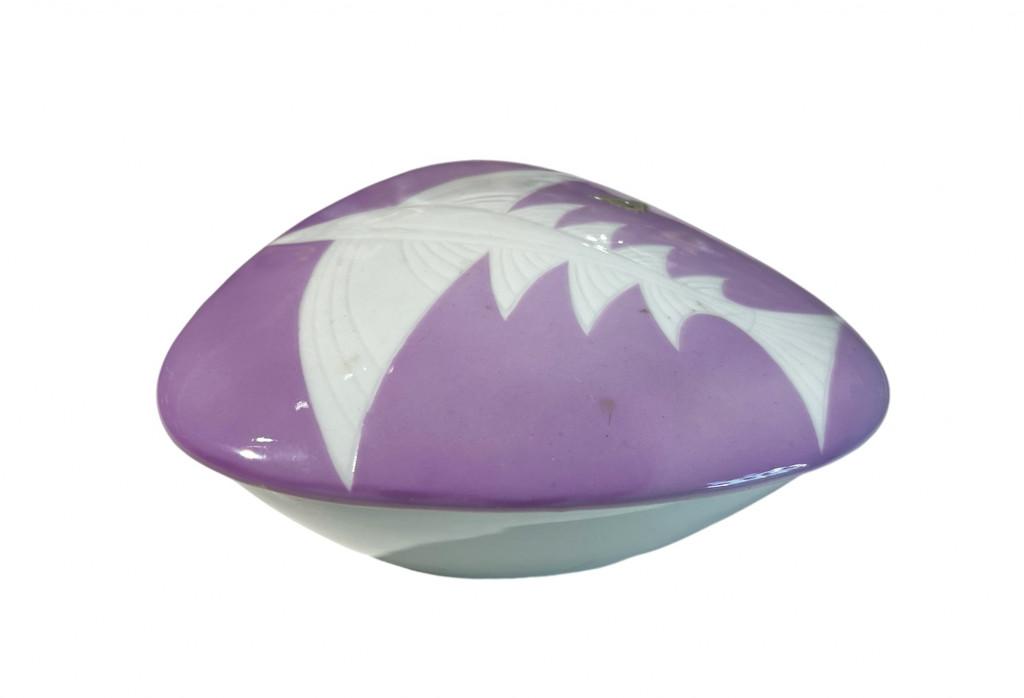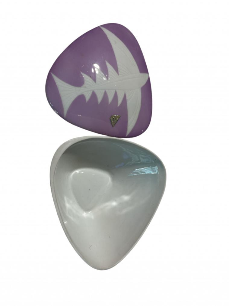 Elegantní dóza v designu Brusel, od Jaroslava Ježka, s motivem bílé létající rybky. Značka Royal Dux. Na výšku měří 9 cm, na šířku 14 cm. Spodní část bílá, víčko s fialovou glazurou. V perfektním stavu bez poškození, značeno ze spodní strany modrým razítkem Royal Dux - made in Czechoslovakia a trojúhelníkovou nálepkou na víčku.