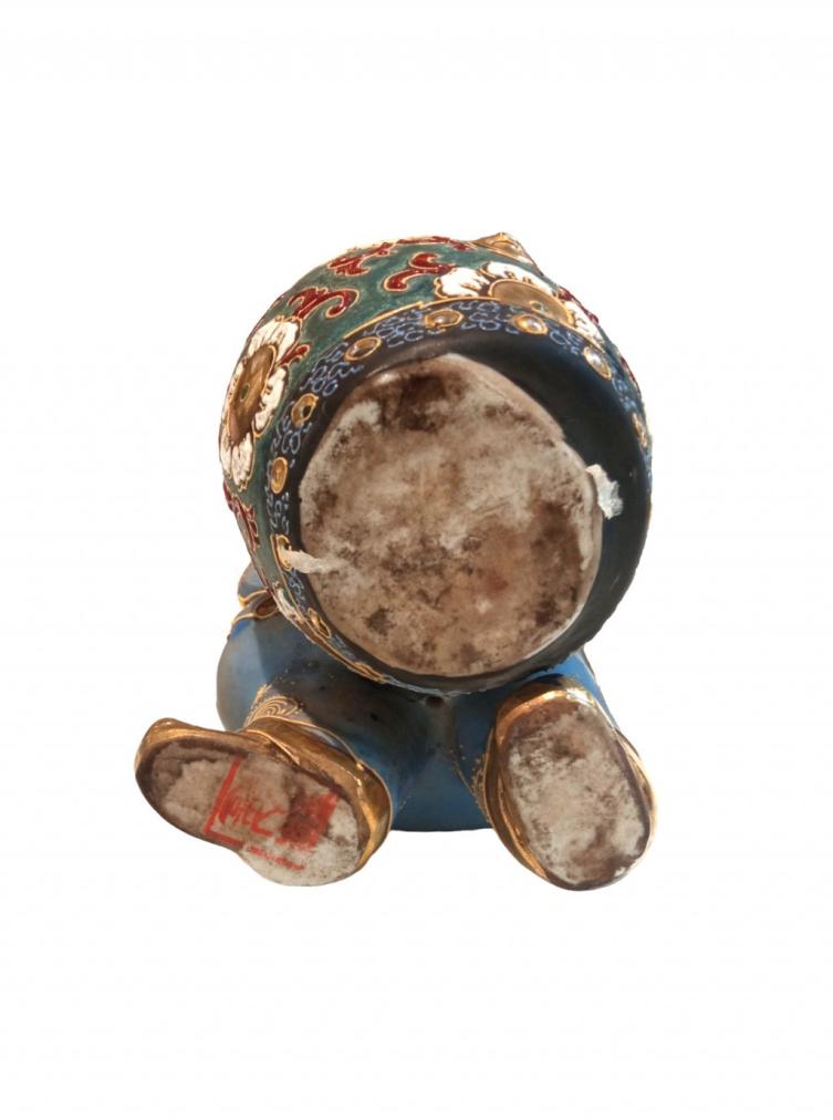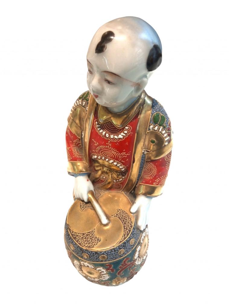 Porcelánová socha čínského bubeníka v krásných barvách, zdobená florálními motivy a zlacená. Zlatá barva je na několika místech lehce setřená. Výška sošky je 22 cm. Začátek 20. století.