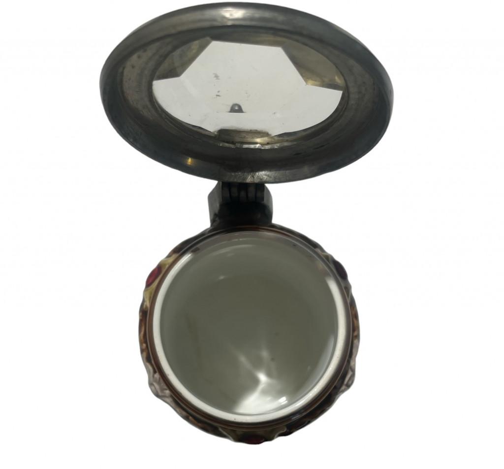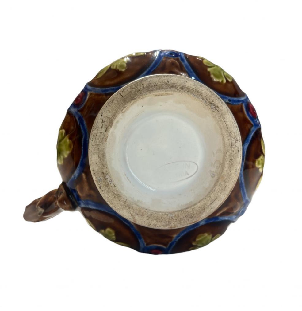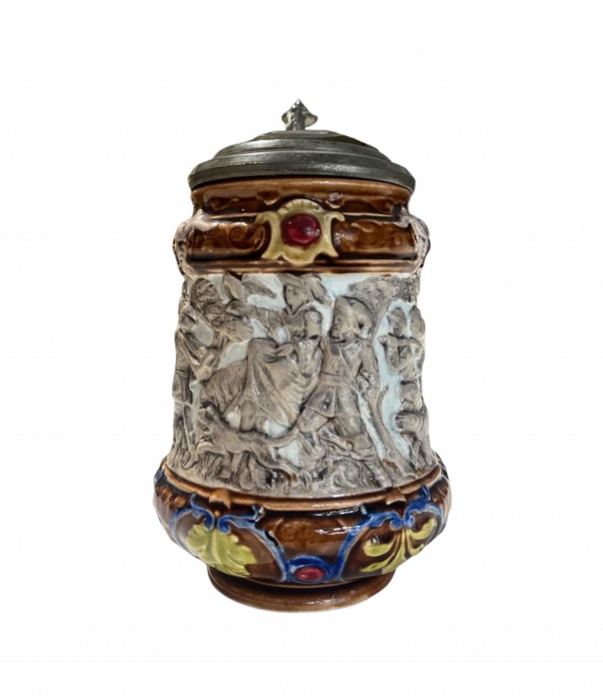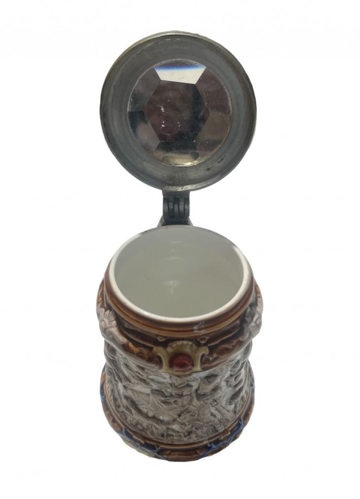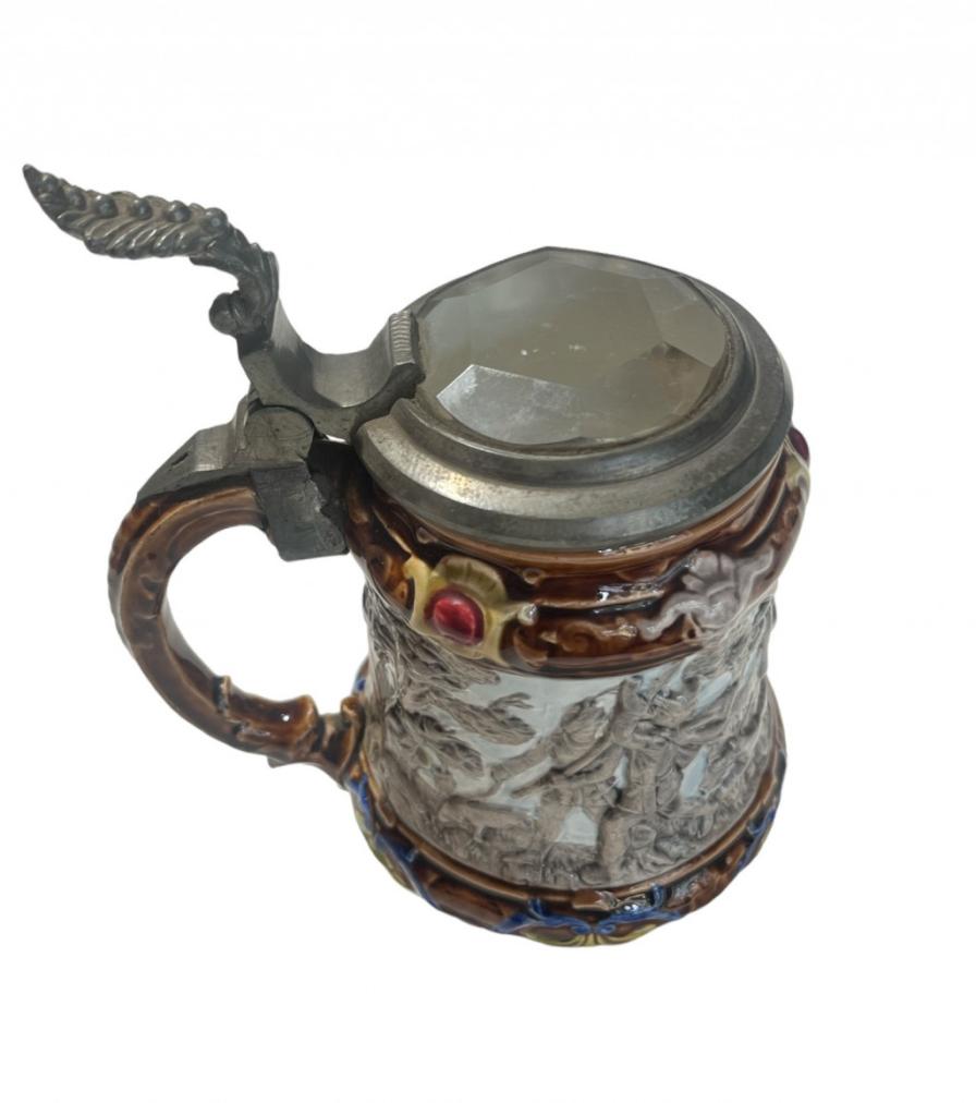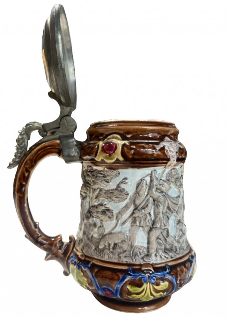 Secesní majolikový korbel bohatě zdobený vystouplým reliéfem s loveckou tematikou z dílen keramické manufaktury v Olomučanech - Schutz Blansko. Korbel je opatřen připevněným kovovým víkem s proskleným středem. Celkové rozměry 19 x 15 cm, hloubka 12,5 cm. Značeno Made in Austria v oválku.