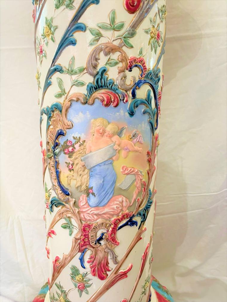 Výška sloupu 100 cm, výška květináče 35 cm, průměr podstavy sloupu 50 cm, průměr vázy 42 cm, materiál: keramika, ručně zdobené florálními motivy, nese známky užívání - oděrky, odštěpky, květináč lze odejmout ze sloupu - skládá se ze dvou částí, sloup uvnitř vyztužen, značeno Eichwald.