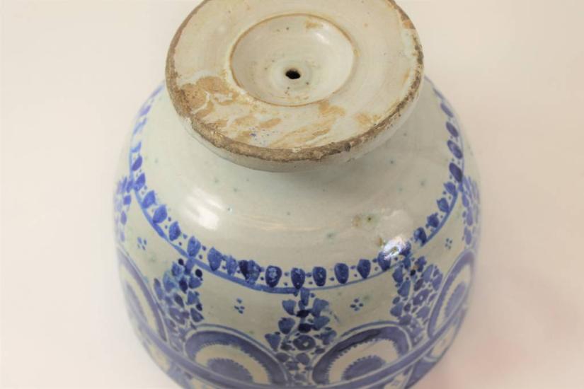 Keramický lidový květináč z 19.stol.,modrobílý dekor,