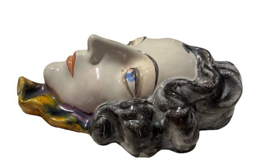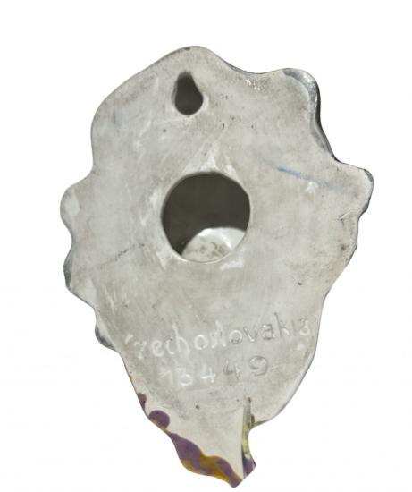 Krásná tvář ženy s melancholickým výrazem a blankytně modrýma očima, kterými vám hledí přímo do duše. Závěsný, ručně malovaný porcelánový portrét. Na délku měří 25 cm, na šířku 14 cm, tloušťka/ hloubka cca 7 cm. Značeno ze spodní strany dole Czechoslovakia a číslice 13449. Pod bradou má odlomen kousek šátku, zabroušeno.