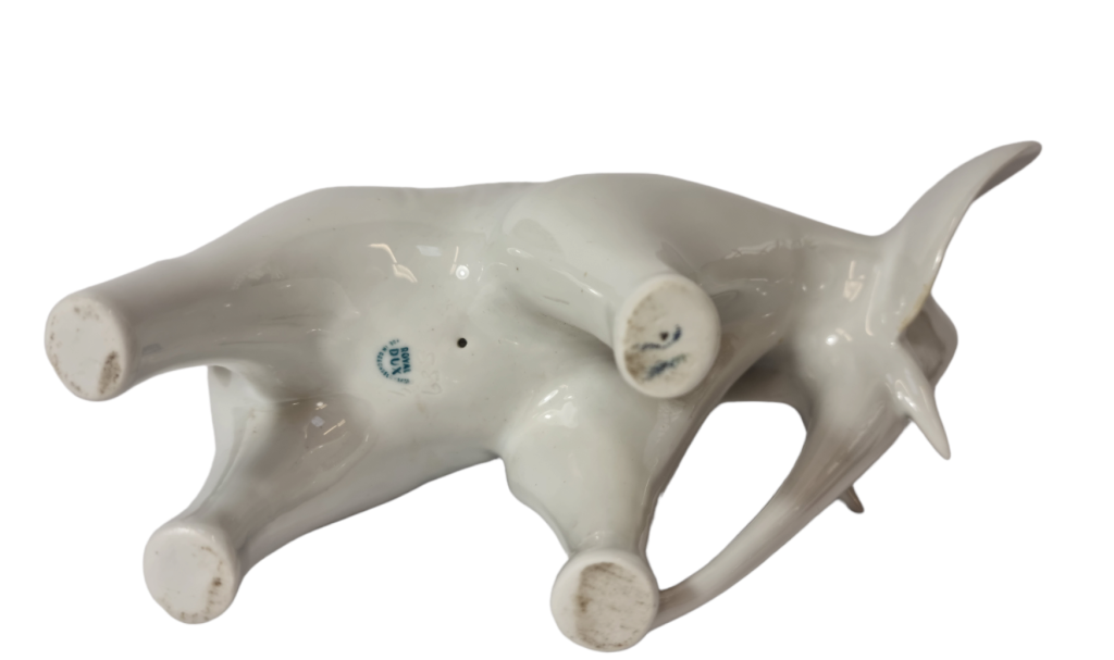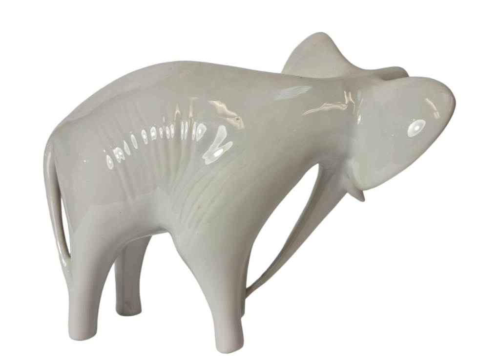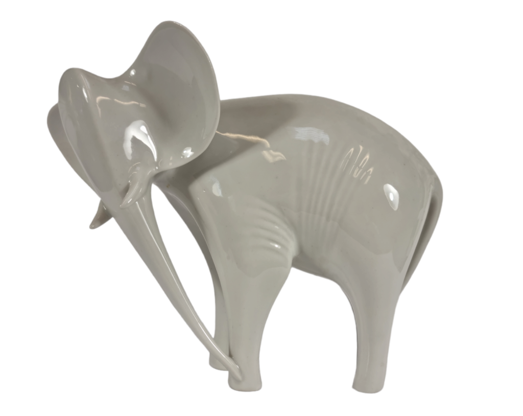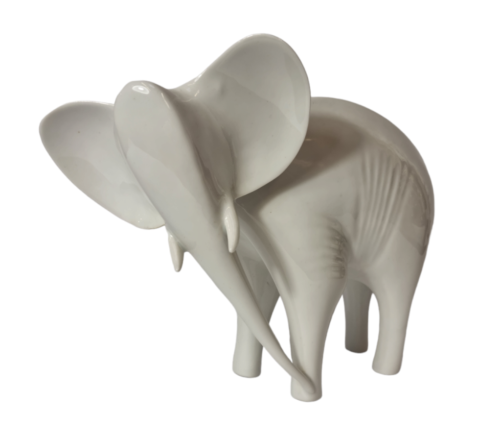 Porcelánová soška slona, zajímavé ztvárnění které kombinuje ostré hrany s jemnými a oblými hranami. Vytváří dojem dynamičnosti s náznakem realistických detailů. Značeno Royal dux, výška 16,5 cm, délka 22 cm. Perfektní stav.