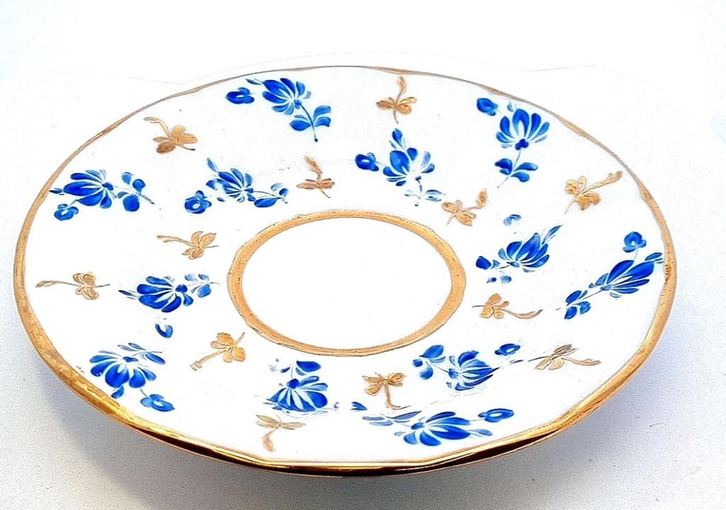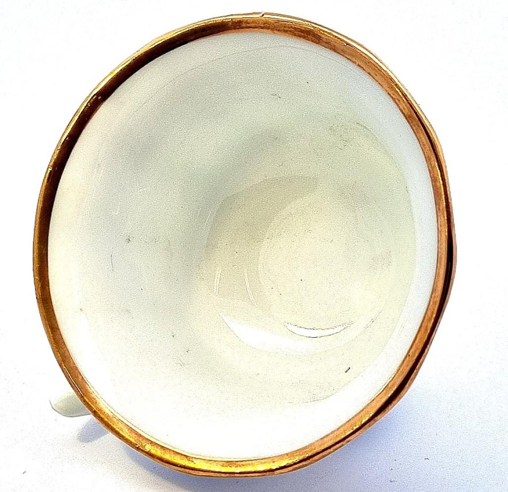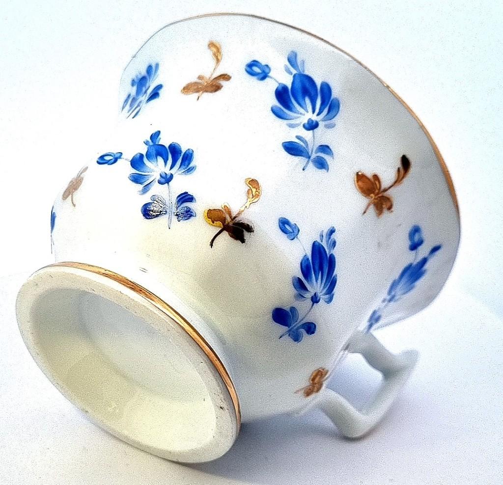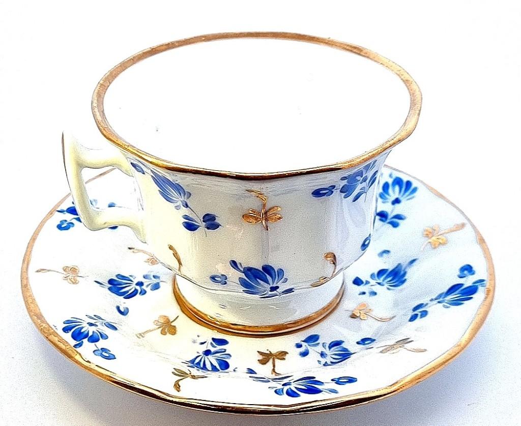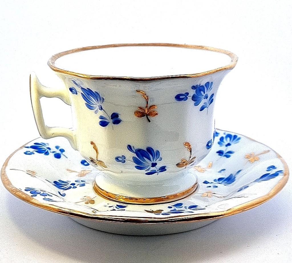 Starožitný porcelánový hrníček s podšálkem. Výška hrníčku 6,5 cm včetně ouška, průměr podšálku 14,5 cm, značeno CF, bezvadný stav.