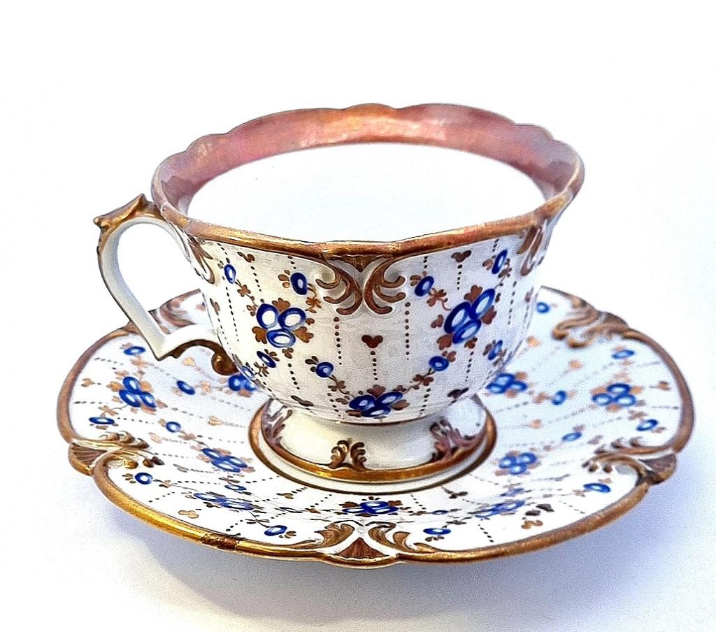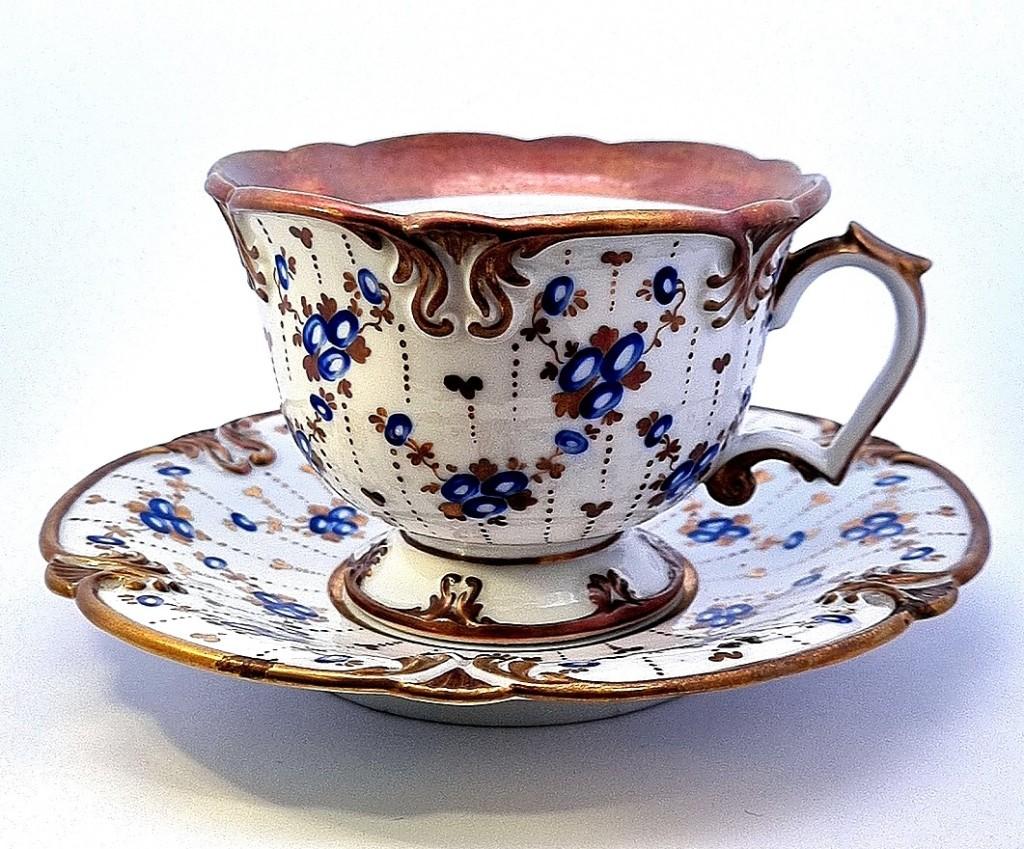 Porcelánový šálek s podšálkem o rozměrech: výška šálku 7 cm, průměr podšálku 16 cm, značeno FL, bezvadný stav.