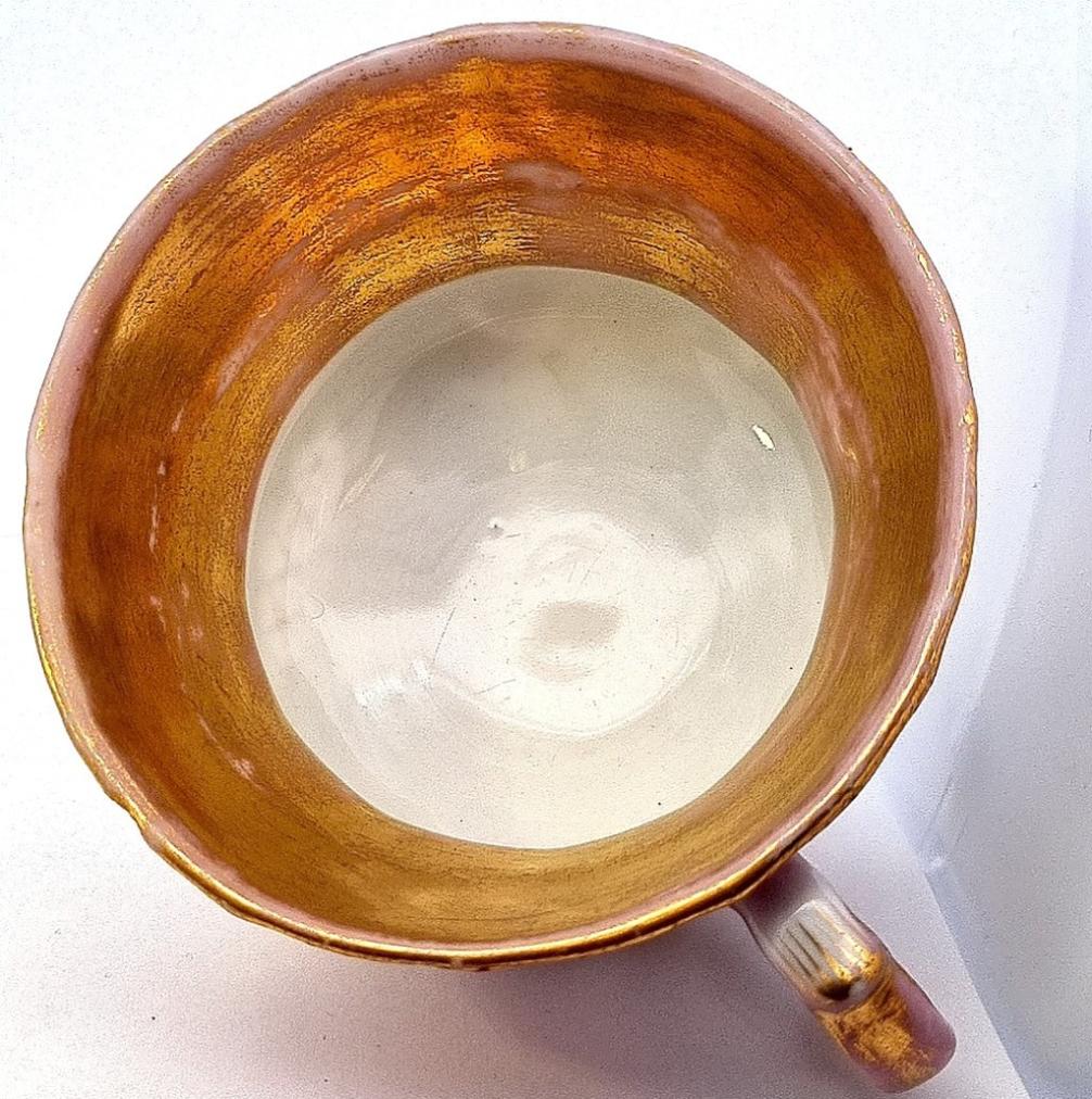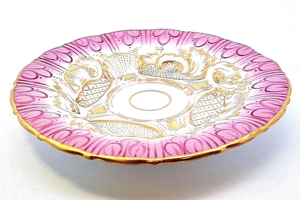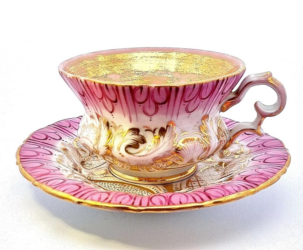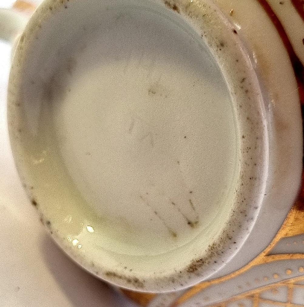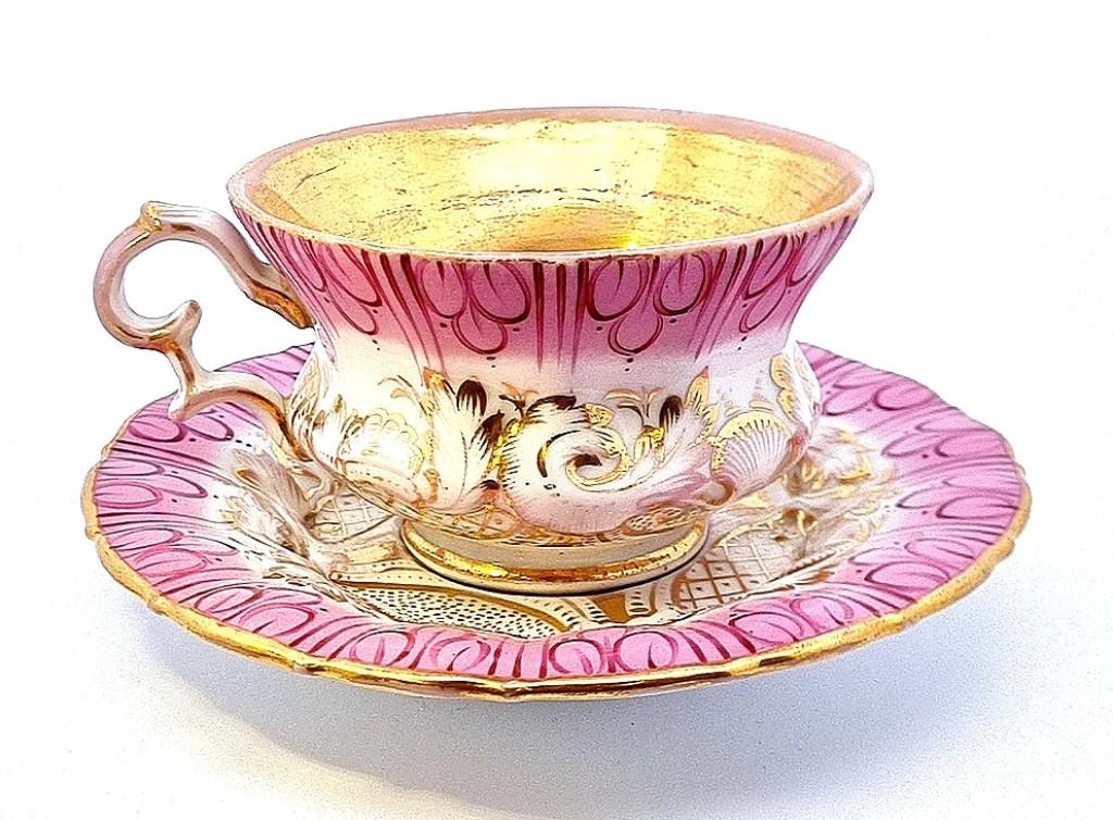 Porcelánový šálek s podšálkem o rozměrech: výška šálku 6,5 cm, průměr podšálku 15 cm. Výrobce: Dolní Chodov (1845 - 1872). Značeno VP. Zlacení lehce setřeno.