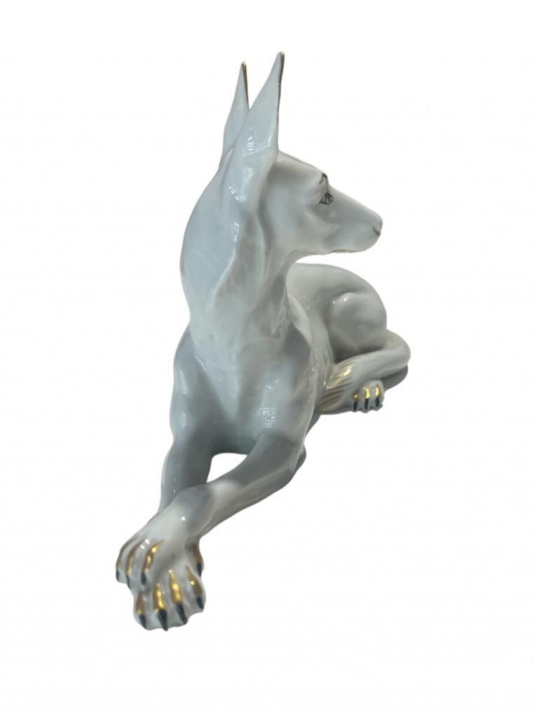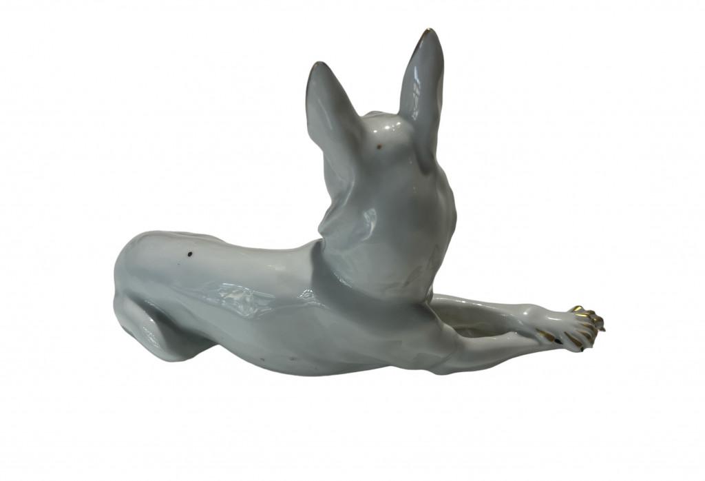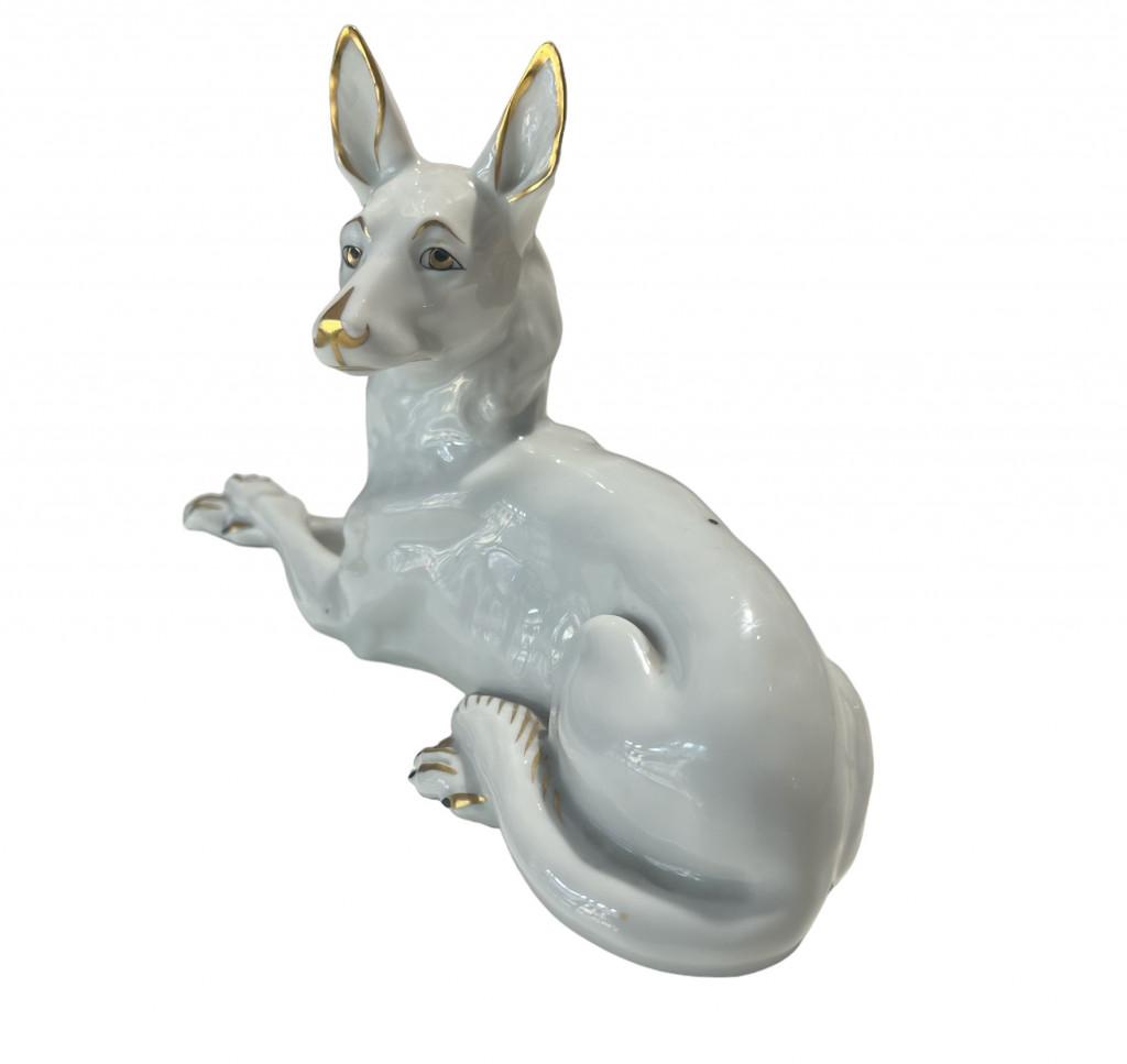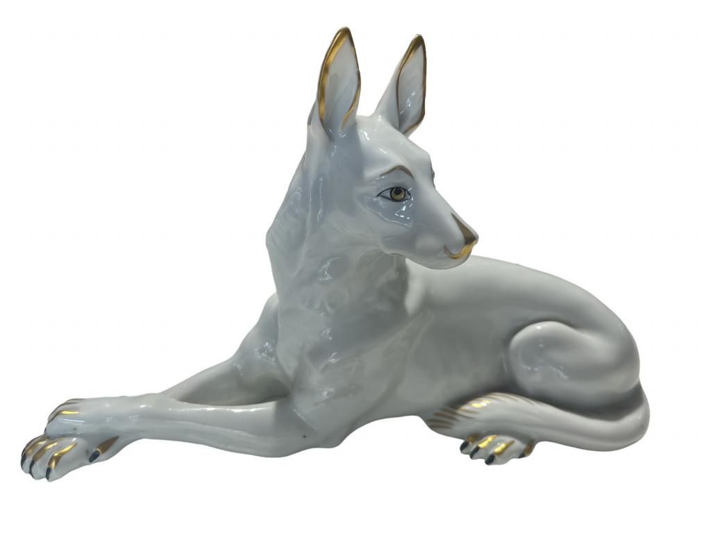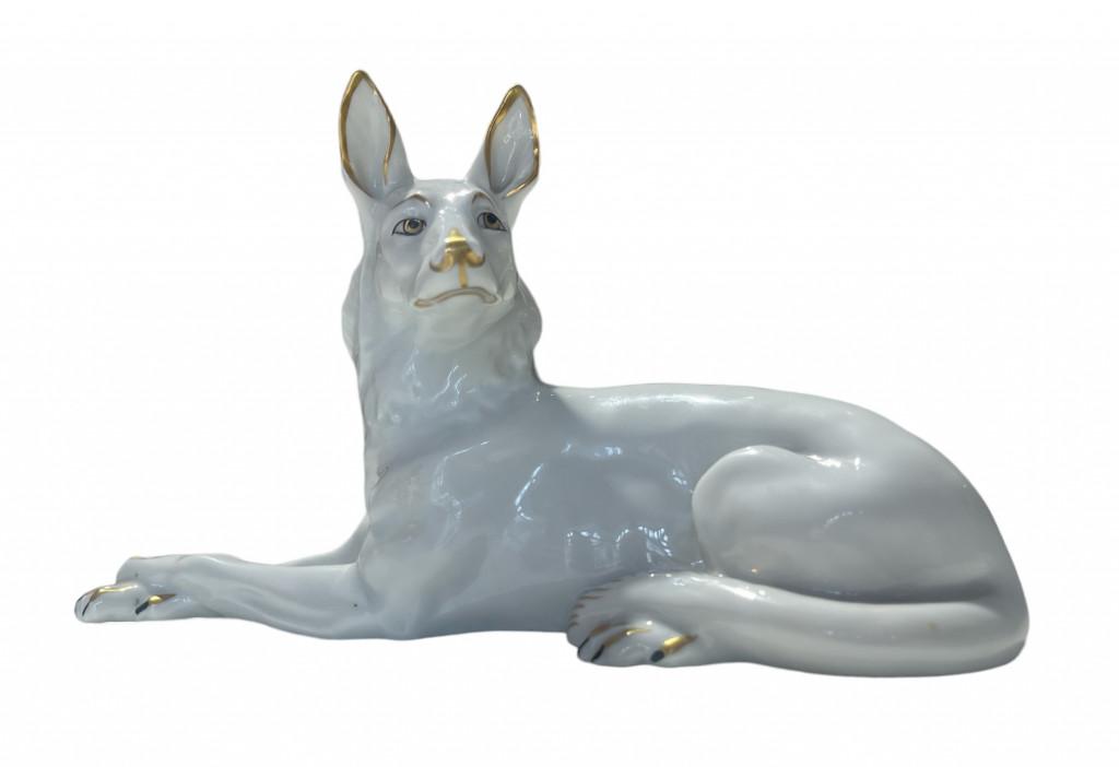 Krásný hlídající vlčák s nastraženýma ušima a pozorným výrazem z německé porcelánky Galluba & Hofmann v Ilmenau. Pes má bílou barvu doplněnou zlatými detaily a černými konturami. Značeno ze spodní strany dole značkou GH v erbu s korunkou. Rozměry 22 x 13 cm.