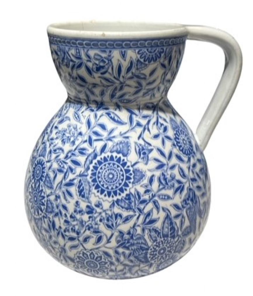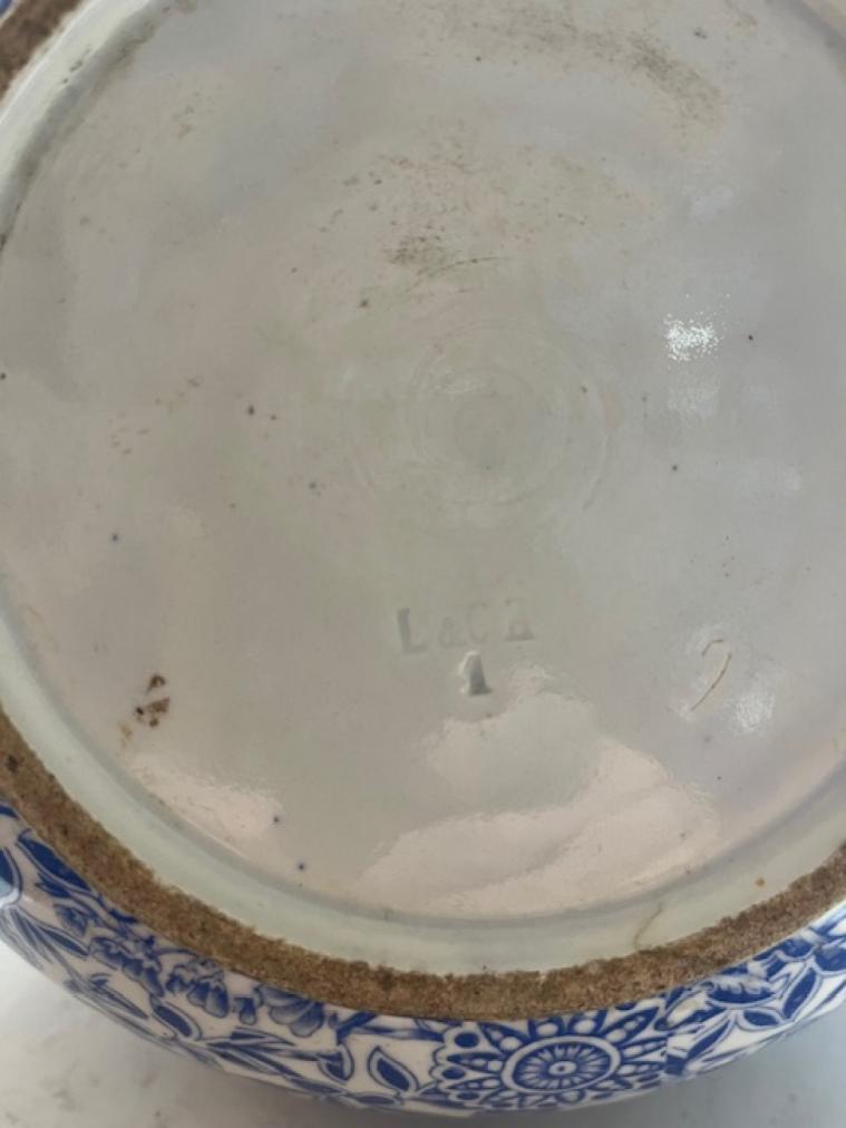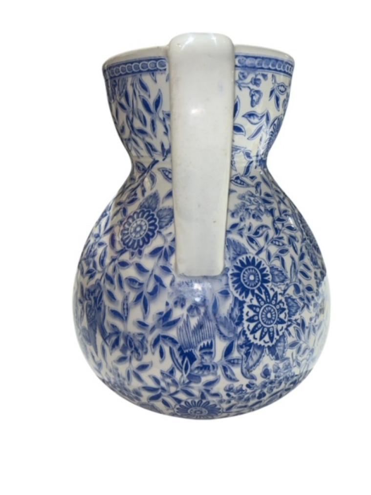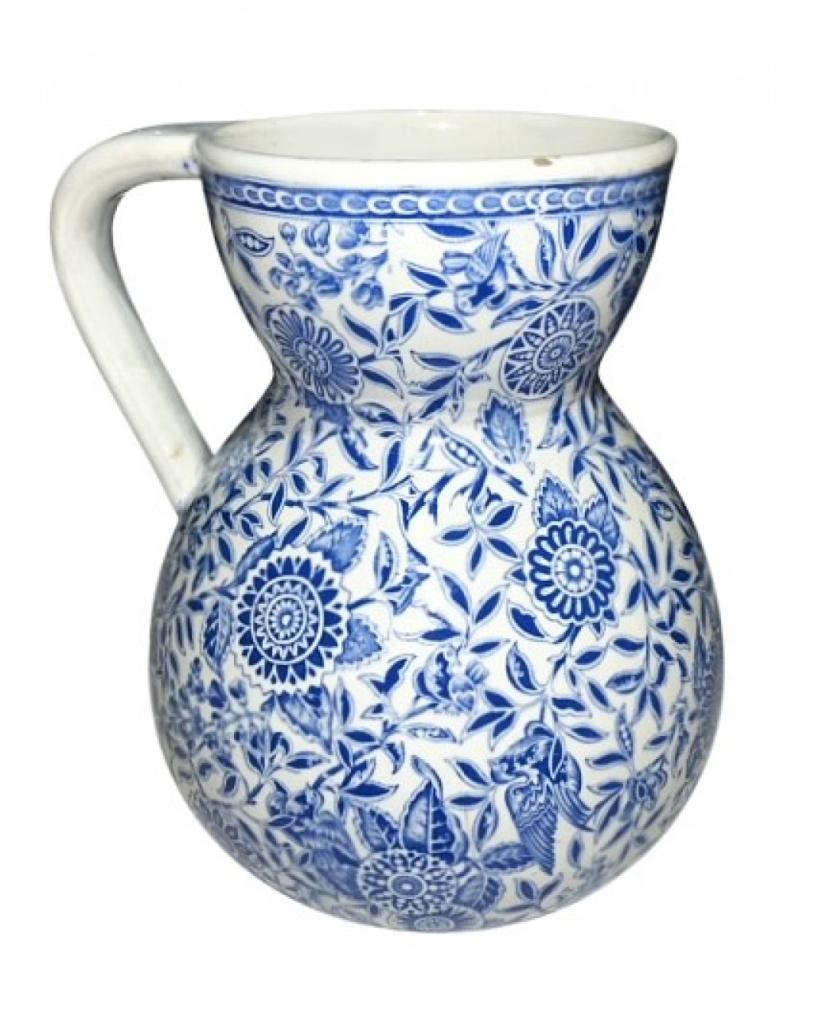 Mohutný keramický džbán, zdobený krásnými florálními obrazci s holubicemi. Džbán měří na výšku 27 cm, v nejširším bodě měří cca 24 cm. Průměr hrdla je 13 cm, průměr podstavy také. Místy krakelace glazury, z vnější strany hrdla menší oťuk. Bílý interiér džbánu je narušen neobarveným místem viz foto. Pod uchem je ozdobný motiv špatně napojený a mírně rozmazaný. Značeno ze spodní strany podstavy L & CR.