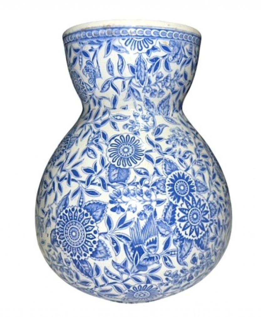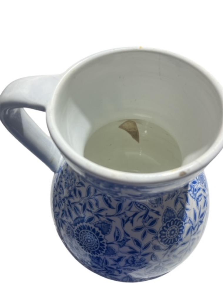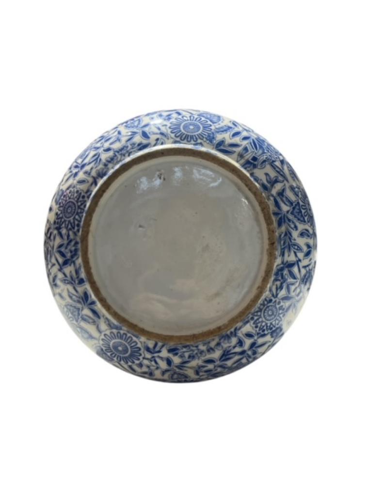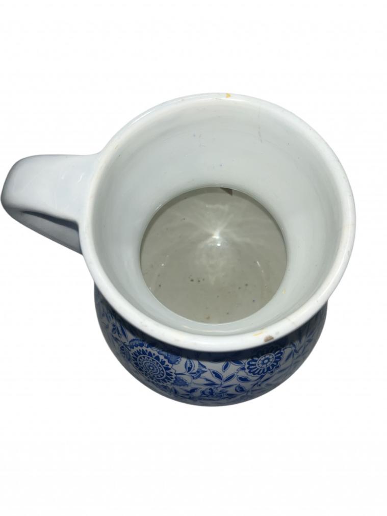 Mohutný keramický džbán, zdobený krásnými florálními obrazci s holubicemi. Džbán měří na výšku 27 cm, v nejširším bodě měří cca 24 cm. Průměr hrdla je 13 cm, průměr podstavy také. Místy krakelace glazury, z vnější strany hrdla menší oťuk. Bílý interiér džbánu je narušen neobarveným místem viz foto. Pod uchem je ozdobný motiv špatně napojený a mírně rozmazaný. Značeno ze spodní strany podstavy L & CR.