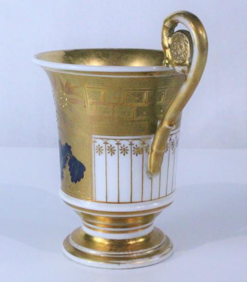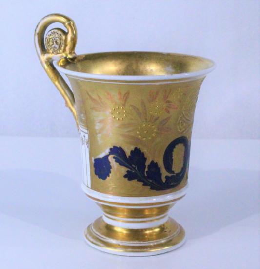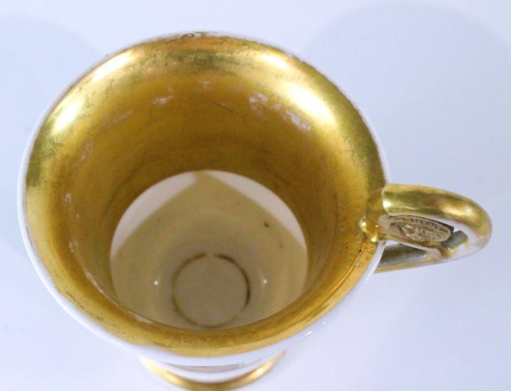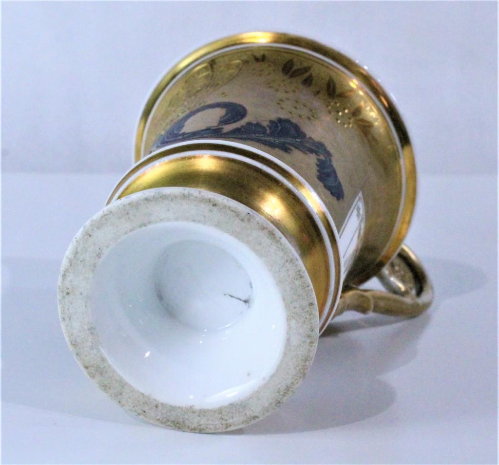 Porcelánový šálek s podšálkem, neznačeno, ručně malované, výška i s ouškem 12 cm, podšálek není, zlacení uvnitř šálku je lehce setřeno.