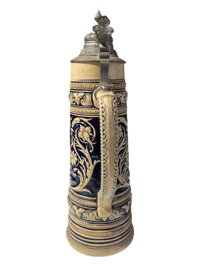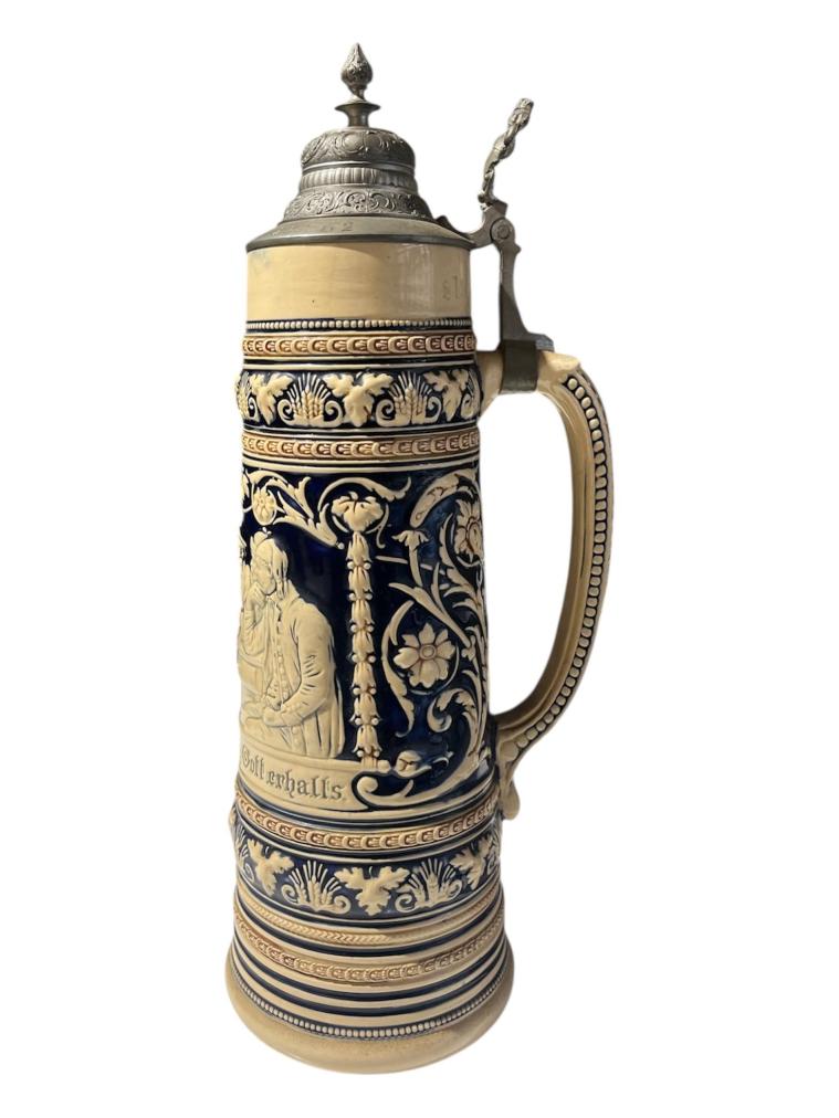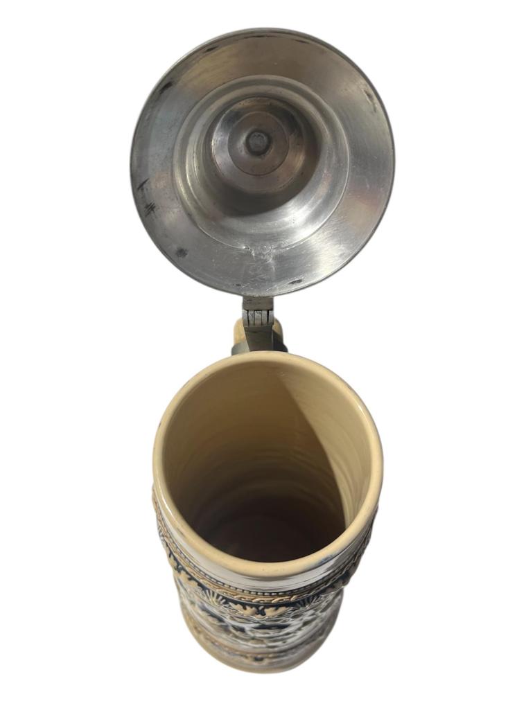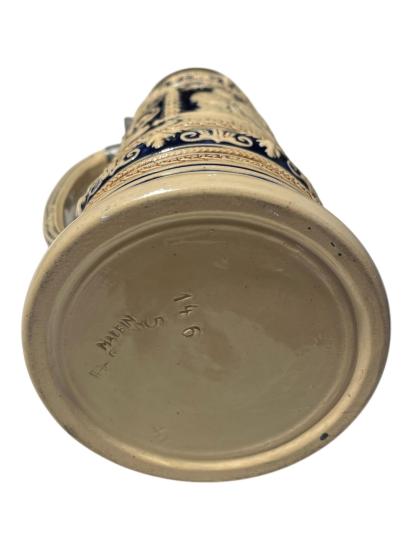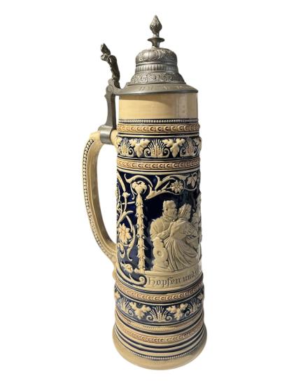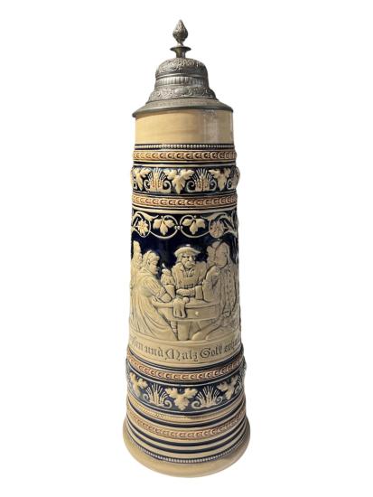 Velký keramický korbel na pivo, bohatě a detailně zdobený reliéfními kresbami, obrazci a lemováním. Pod hlavním motivem- osob sedících u stolu, je nápis: Hopfen und Malz, Gott erhalts- Kéž Bůh chrání chmel a slad. Objem nádoby je 2 litry. Korbel je opatřen mosazným deklíkem, který je připevněn k uchu. Celková výška je 41 cm, průměr hrdla je 9 cm. Průměr podstavy je 13 cm. Značeno ze spodní strany podstavy vtlačenou značkou- Made in Germany. V perfektním stavu, bez poškození.