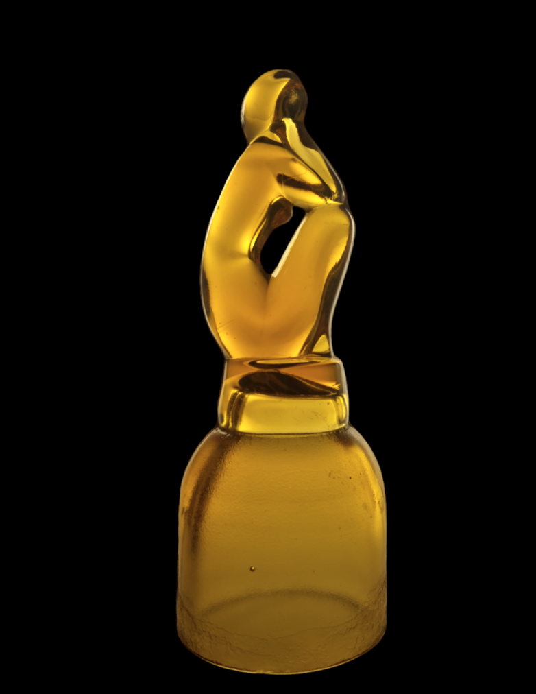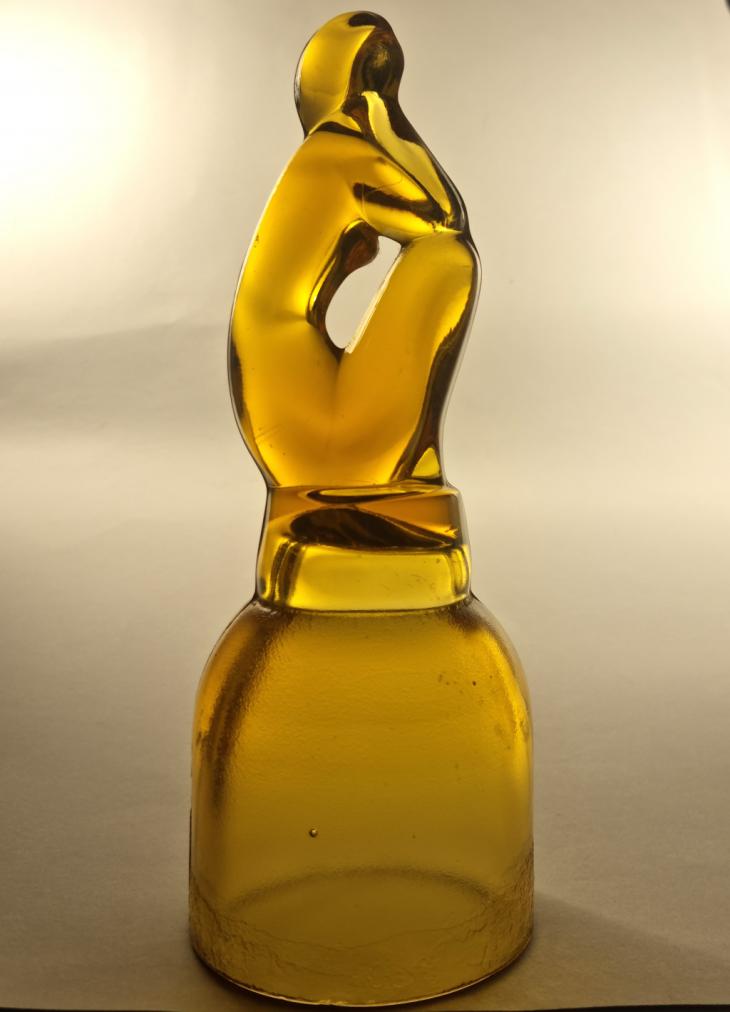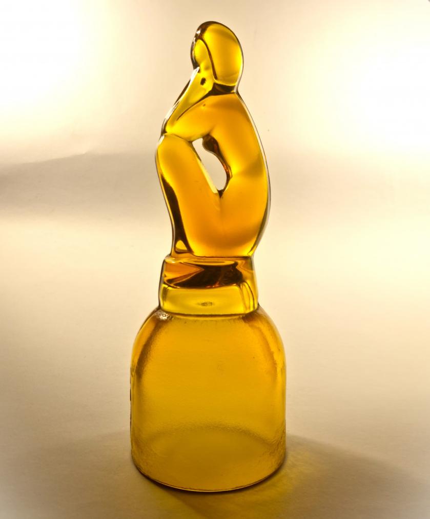 Lisovaná skleněná figura na dutém soklu v ambérové barvě je vysoká cca 25 cm, maximální průměr cca 9 cm.