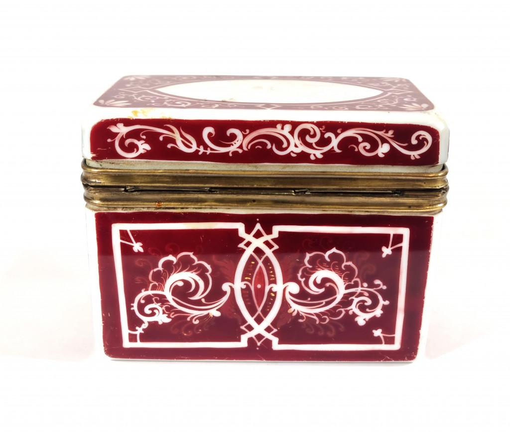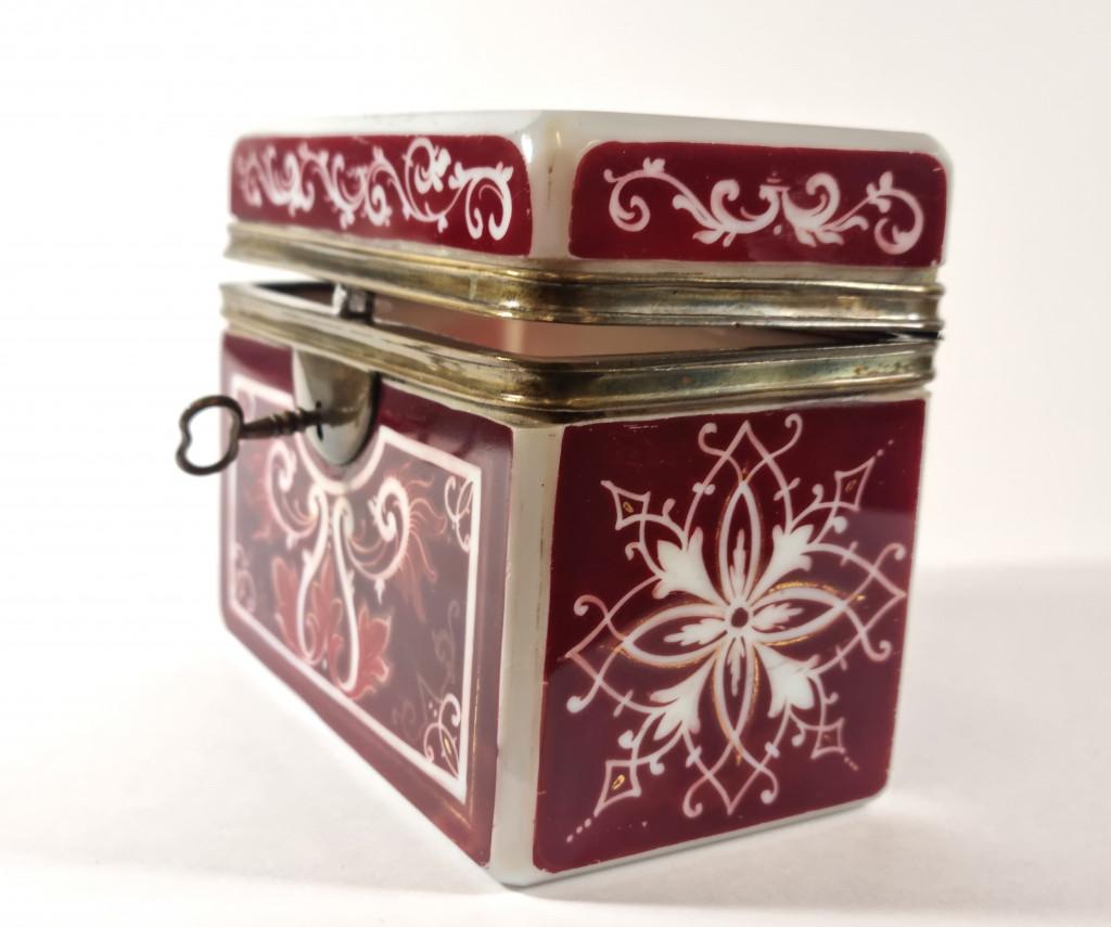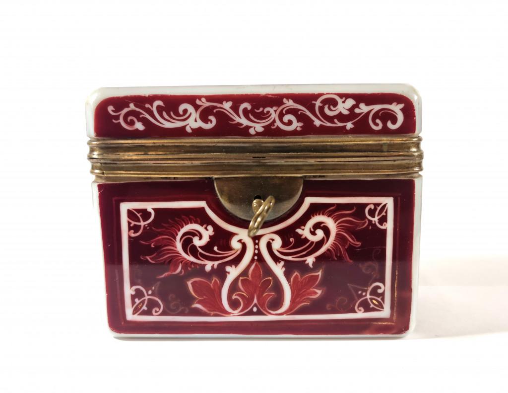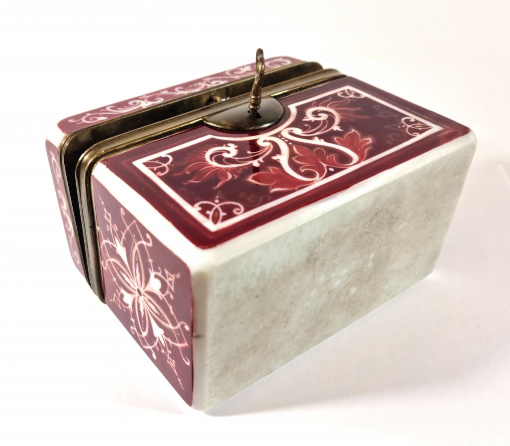 Biedermeier - skleněná dóza, výška komplet 10 cm, šířka 12,5 cm, hloubka 7 cm. Funkční zámek. Bez poškození.