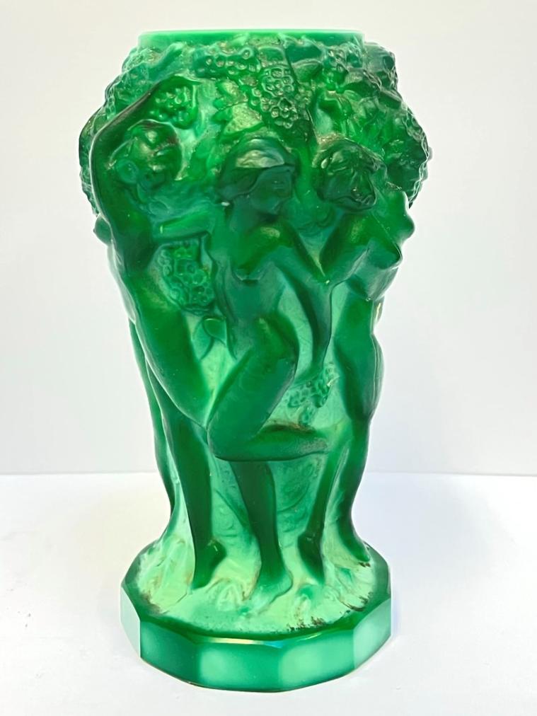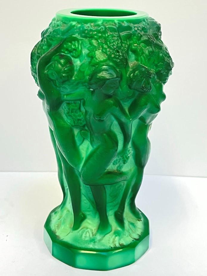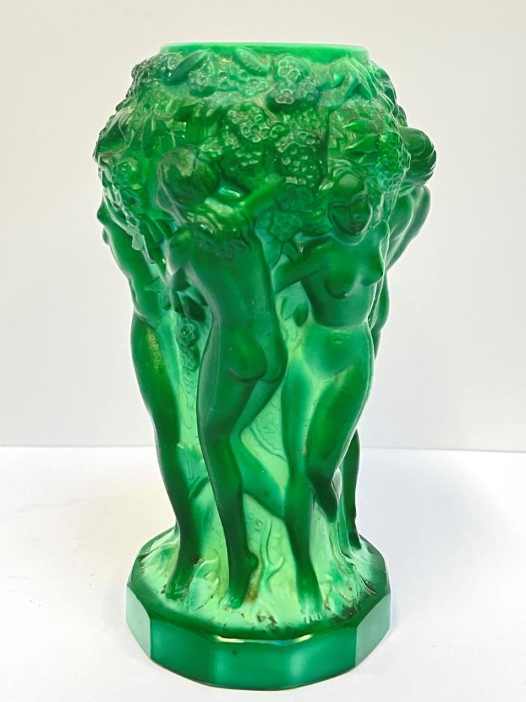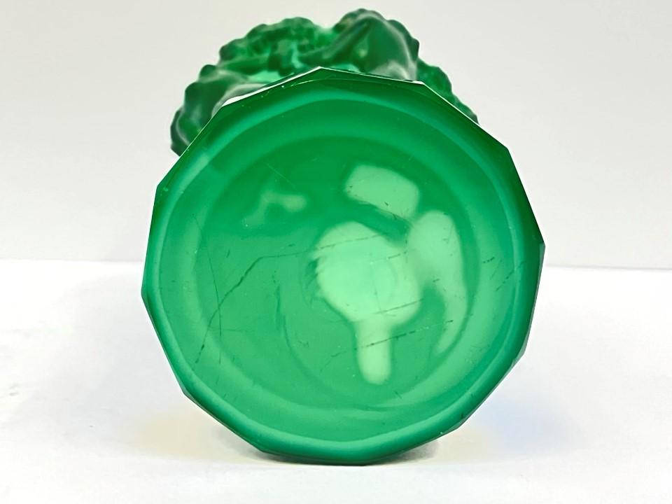 Výška 13 cm, průměr podstavy 5,5 cm, průměr hrdla 4 cm, materiál - malachitové sklo, neznačeno .