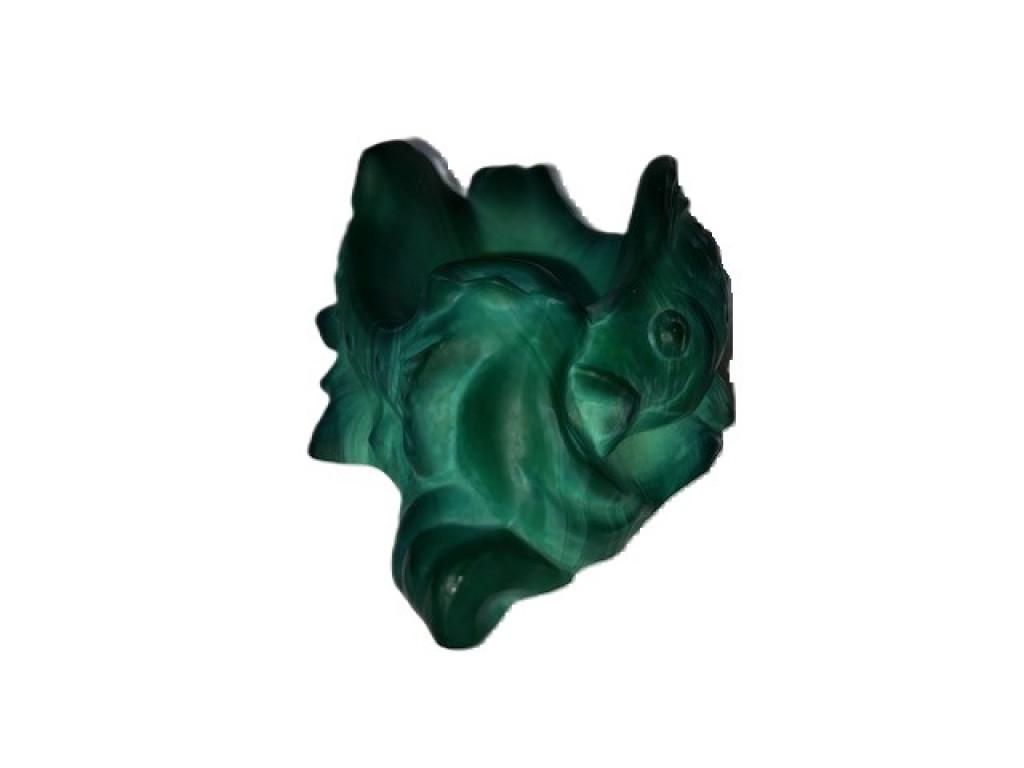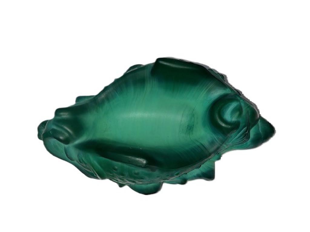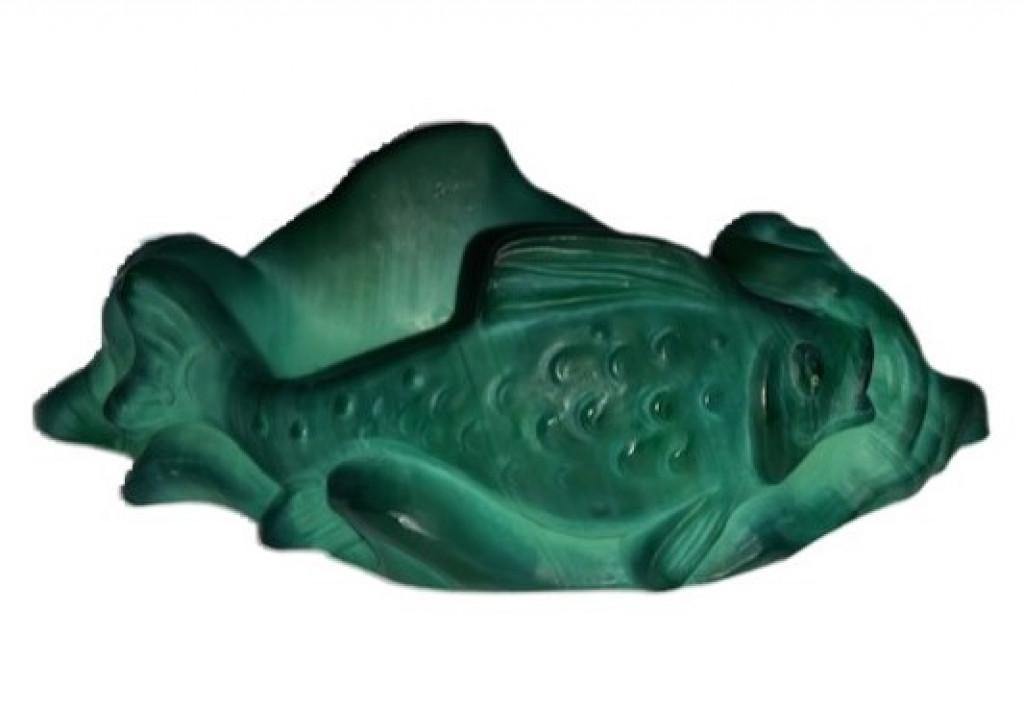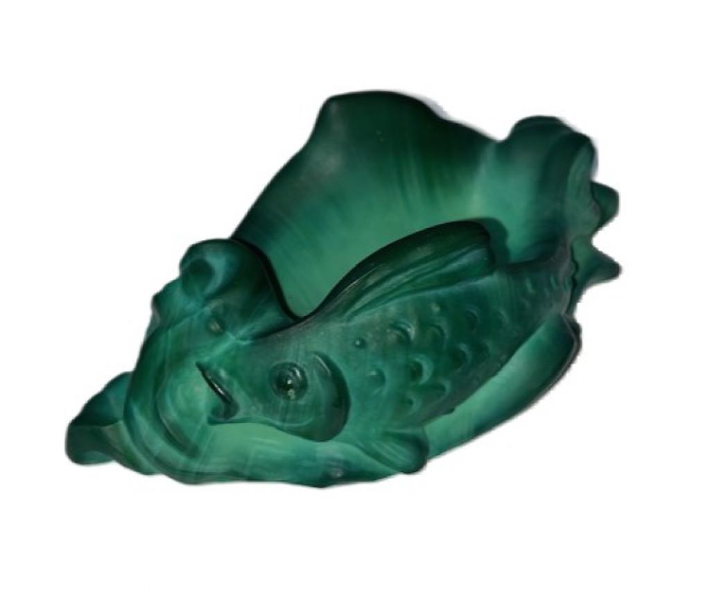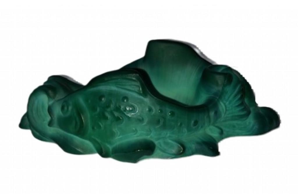 Krásný popelník z malachitového skla s reliéfním vyobrazením ryb po obou stranách. Rozměry 21 x 7 cm.