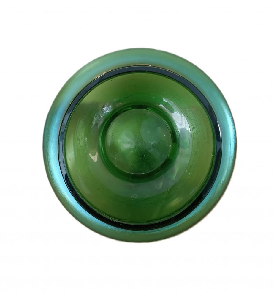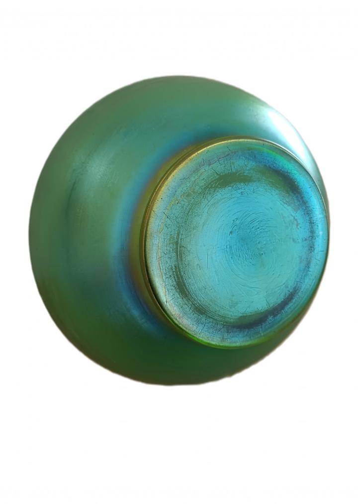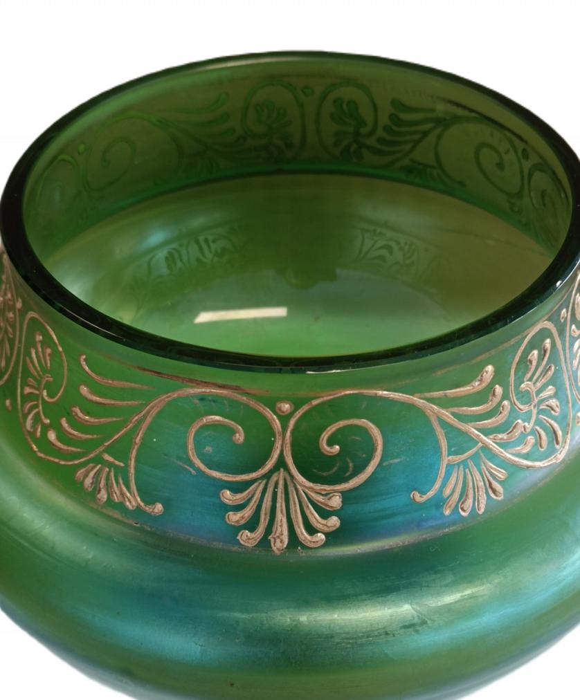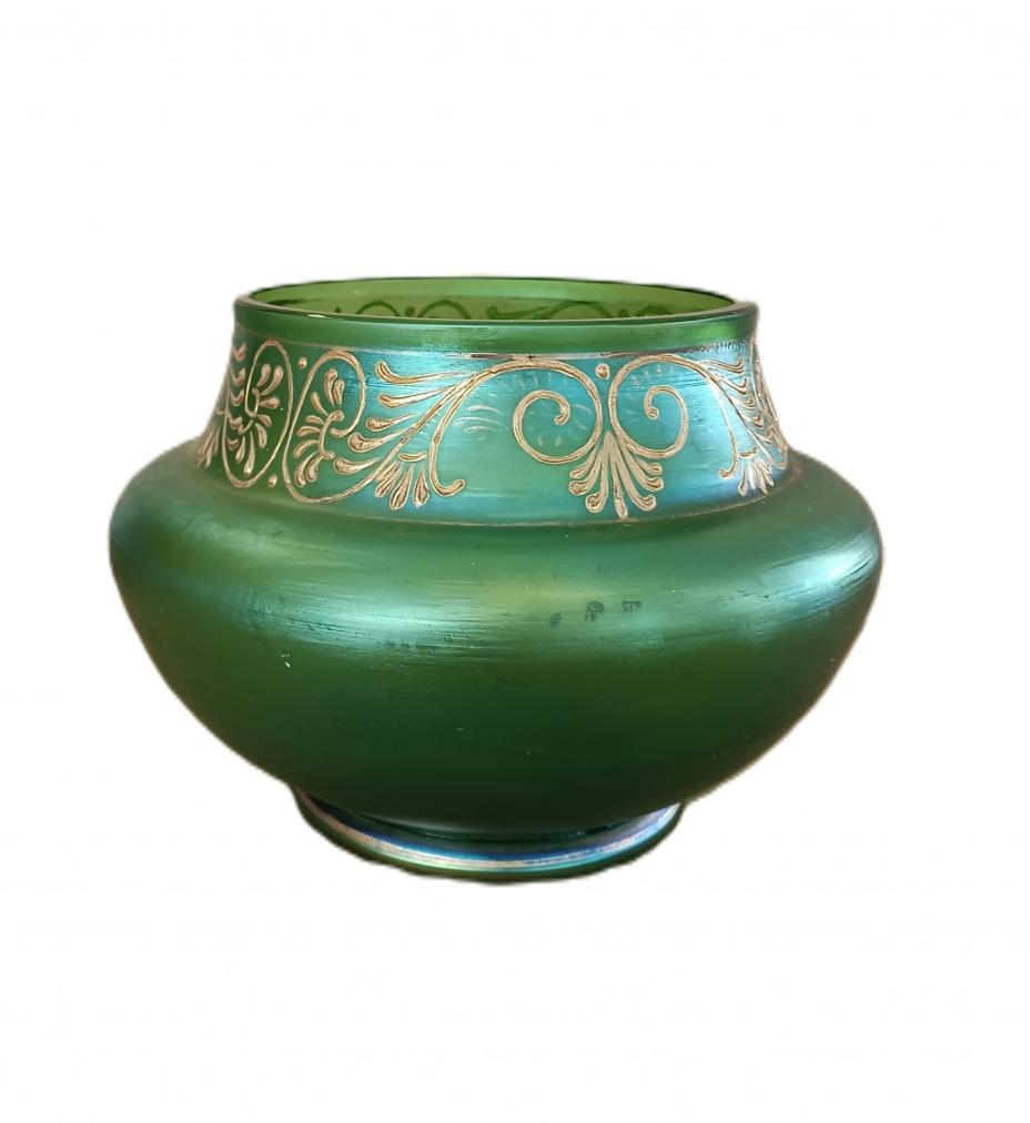 Secesní zelená váza s matným povrchem a irisováním je zdobena zlatou linkou. Zlacení u hrdla a podstavy lehce setřeno. Výška 14 cm. Průměr hrdla 13 cm. Stav viz foto.