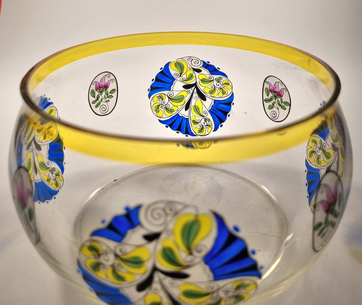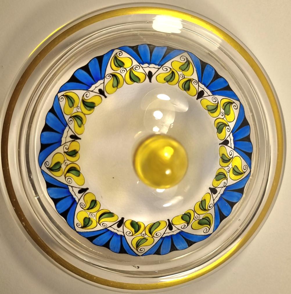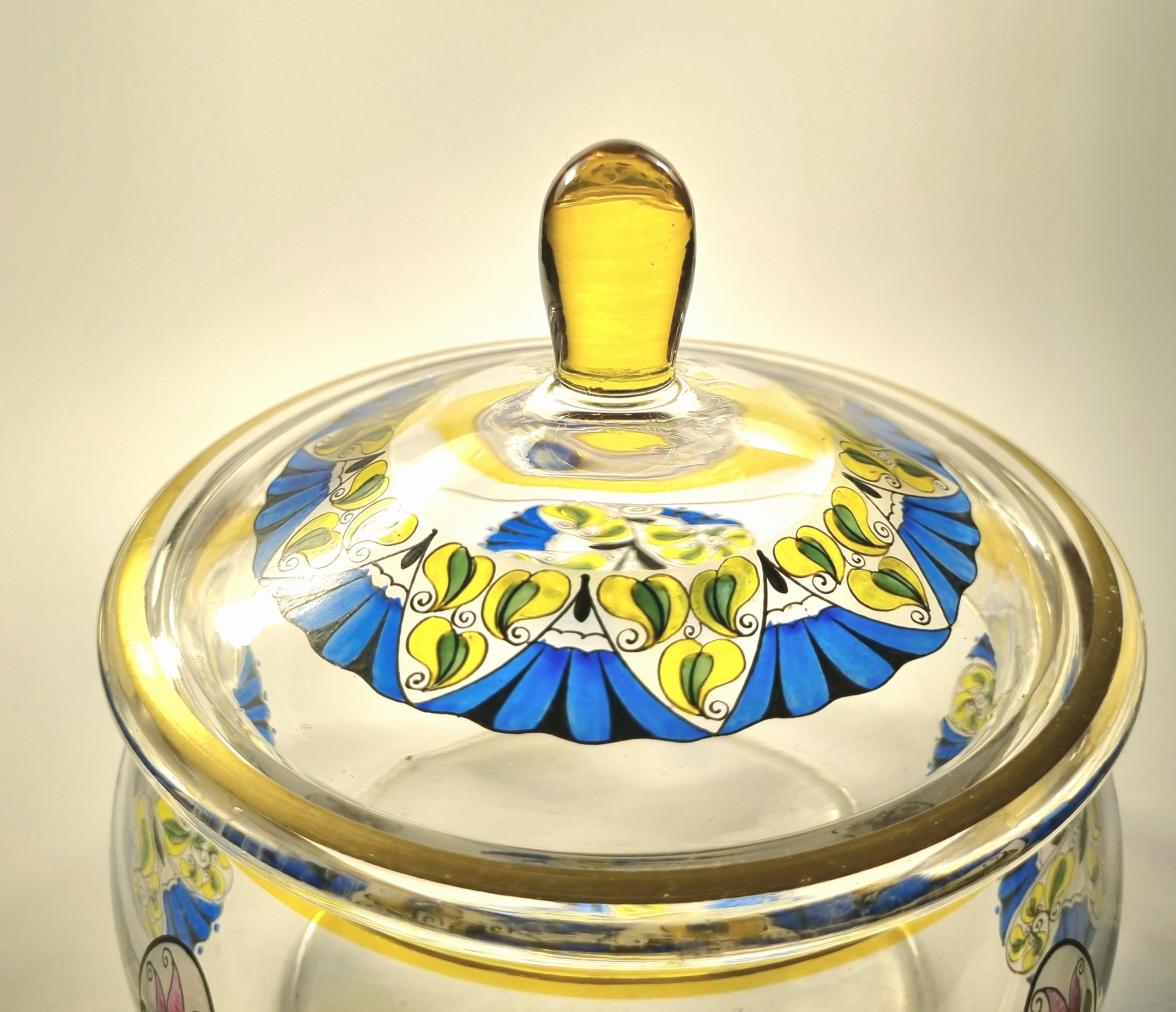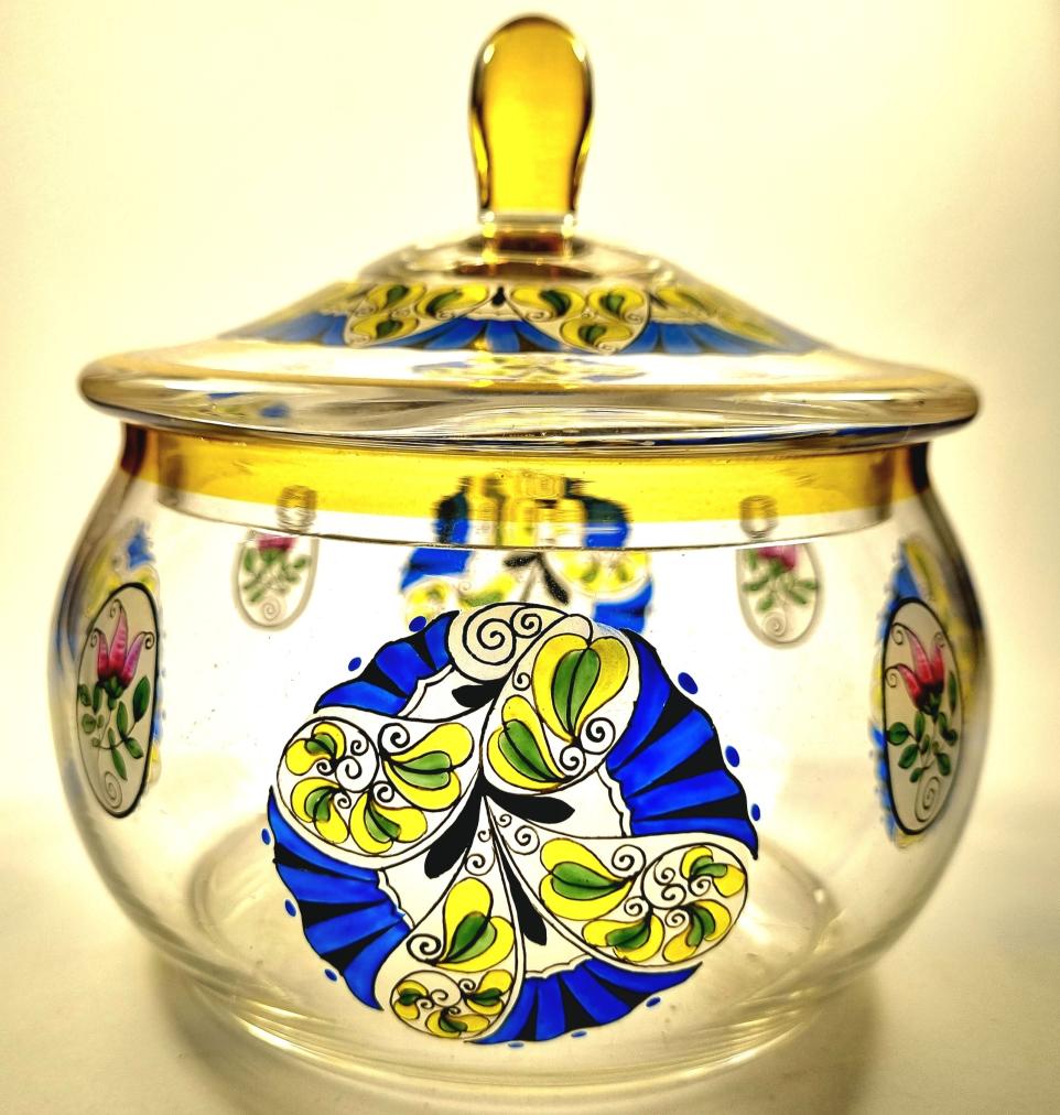 Ručně malovaná skleněná dóza o rozměrech: výška 20 cm, průměr horní části 15 cm.