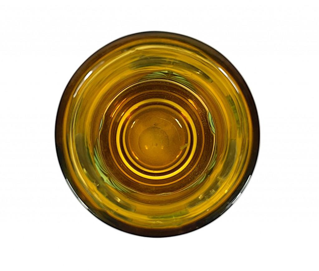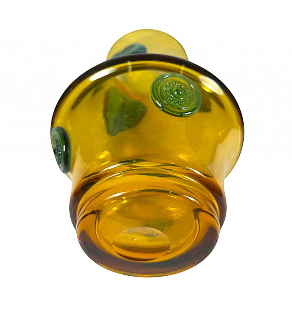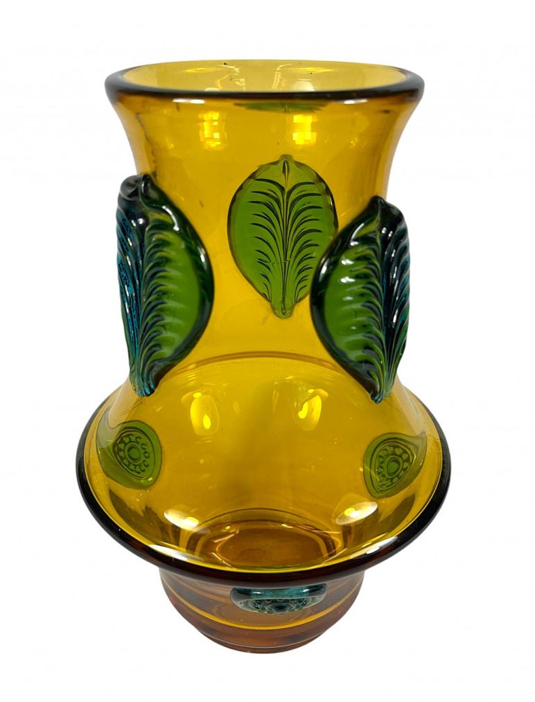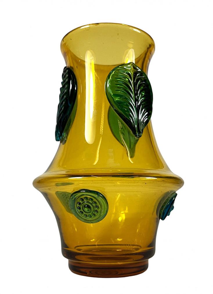 Designová váza z jantarového skla s reliéfním vzorem tmavých, modro- zelených listů, od českého umělce, skláře a grafika Josefa Hospodky. Váza měří na výšku 23 cm, v nejširším bodě měří 15 cm, průměr hrdla je 9,5 cm. Váza je v perfektním stavu bez poškození s mírně poškrábanou podstavou.