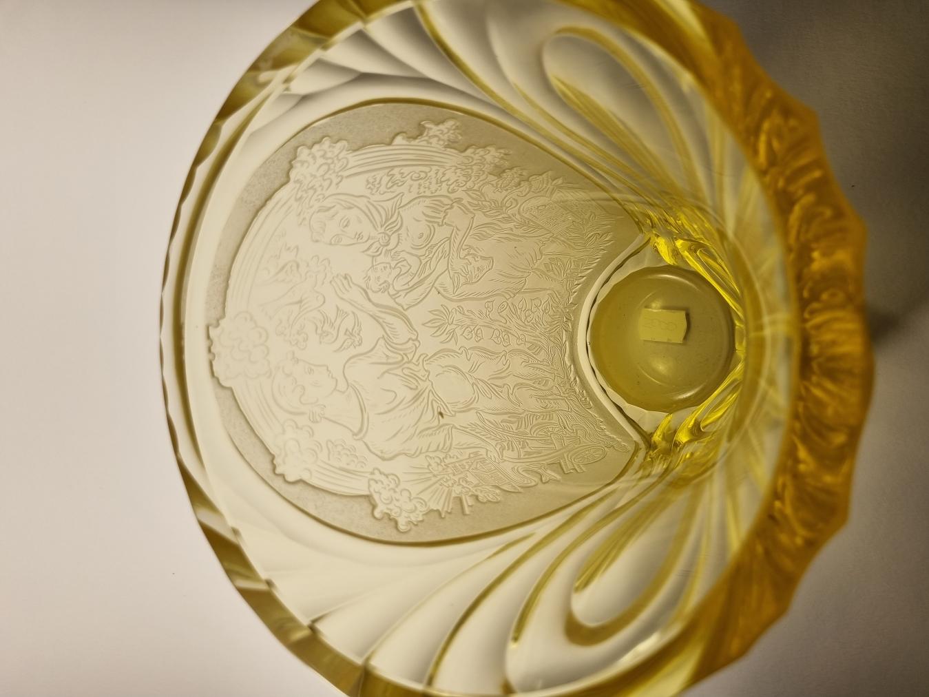 Skleněná váza s figurálním motivem o rozměrech: výška 24 cm, průměr v dolní části 9,5 cm, průměr v horní části 17, 5 cm.