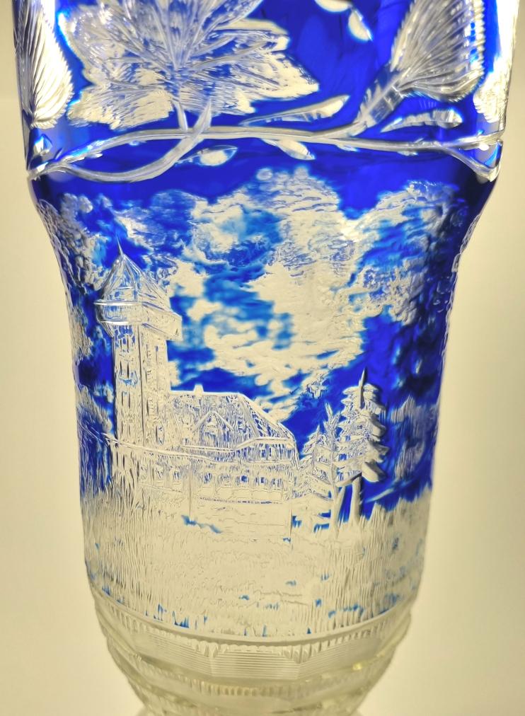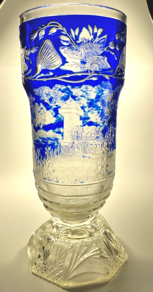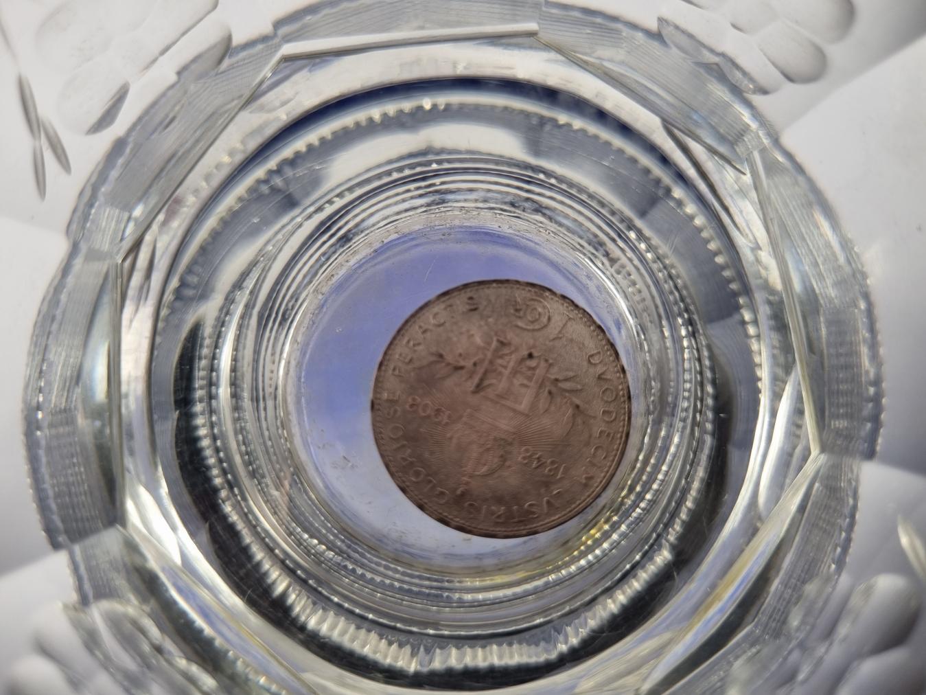 Váza o rozměrech: výška 29,5 cm, šířka 15 cm. Ve spodní části umístěna stříbrná mince 1 koruna Francie Josef I., jubilejní 1908.
