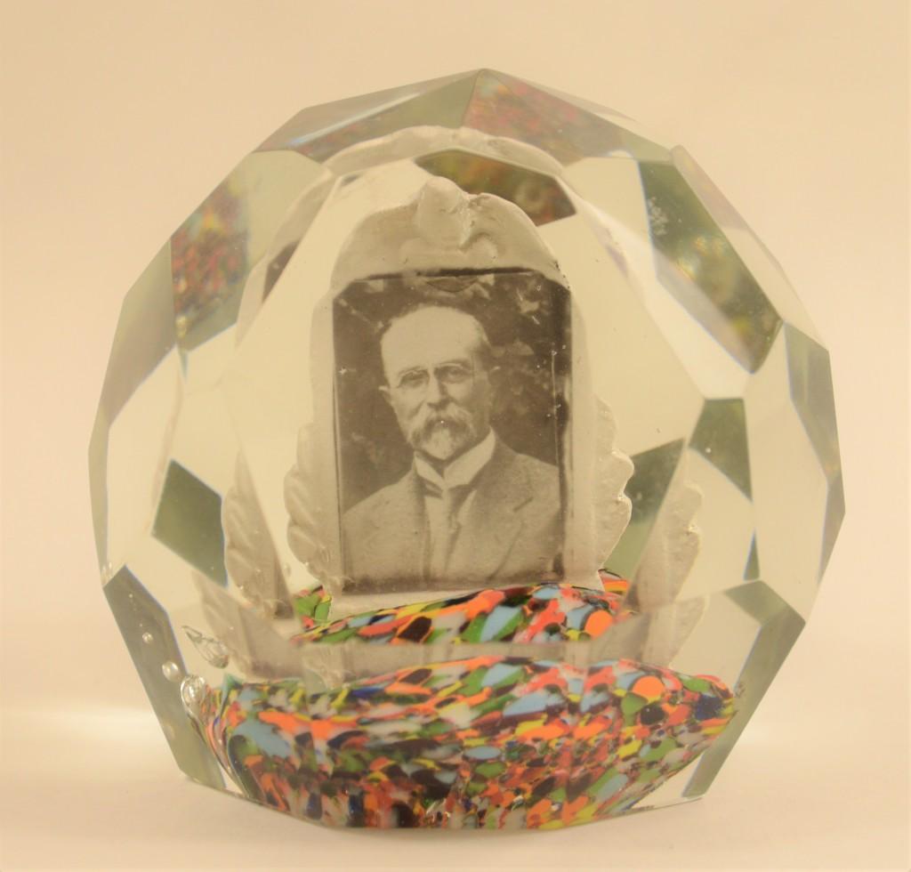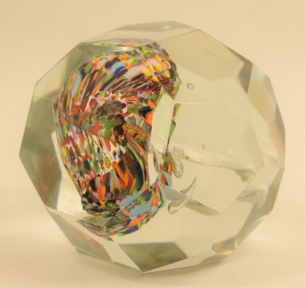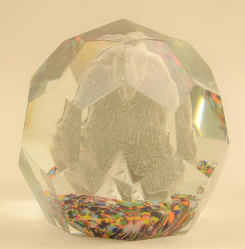 Skleněné těžítko je vysoké 9 cm, průměr cca 9 cm. Na dně lehké škrábance.