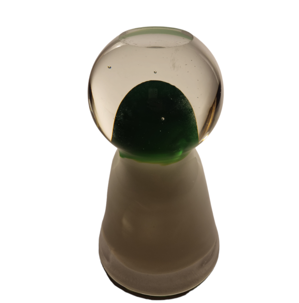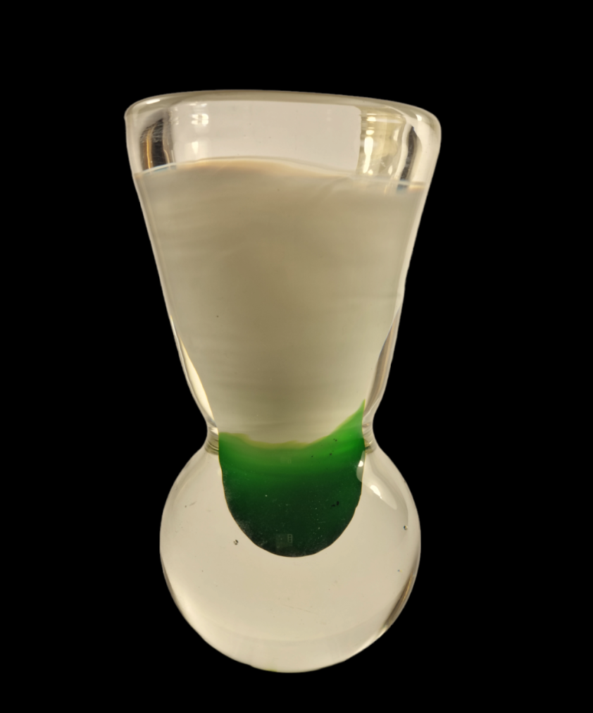 Váza od známého autora Františka Víznera, která je zajímavá kombinací vrchního kuželovitého tvaru se spodní částí, která je kulovitá. Použití bílé a zelené barvy vytváří zajímavé momenty z různých úhlů pohledu. Výška 19 cm, průměr hrdla 10,5 cm.