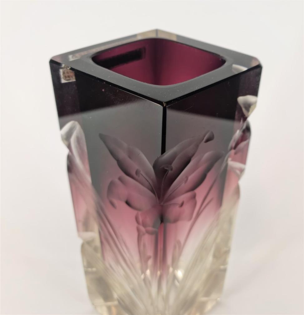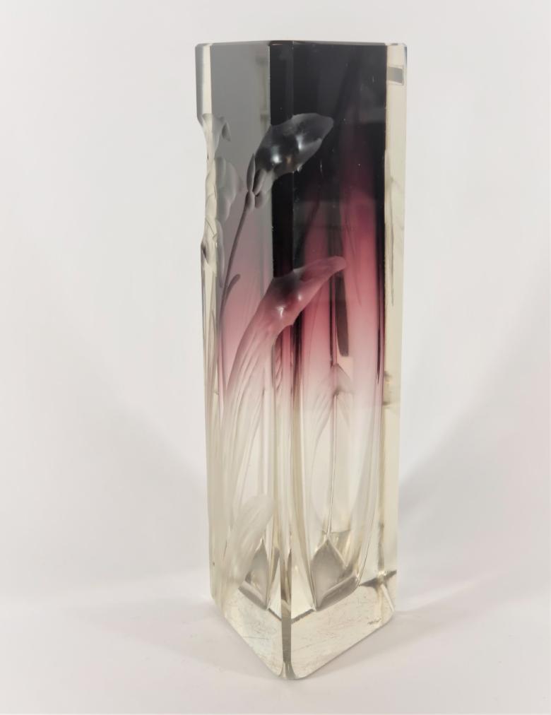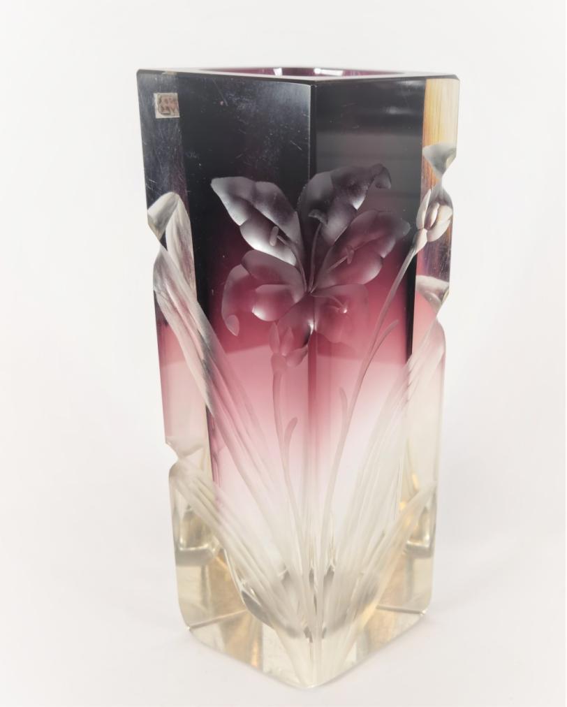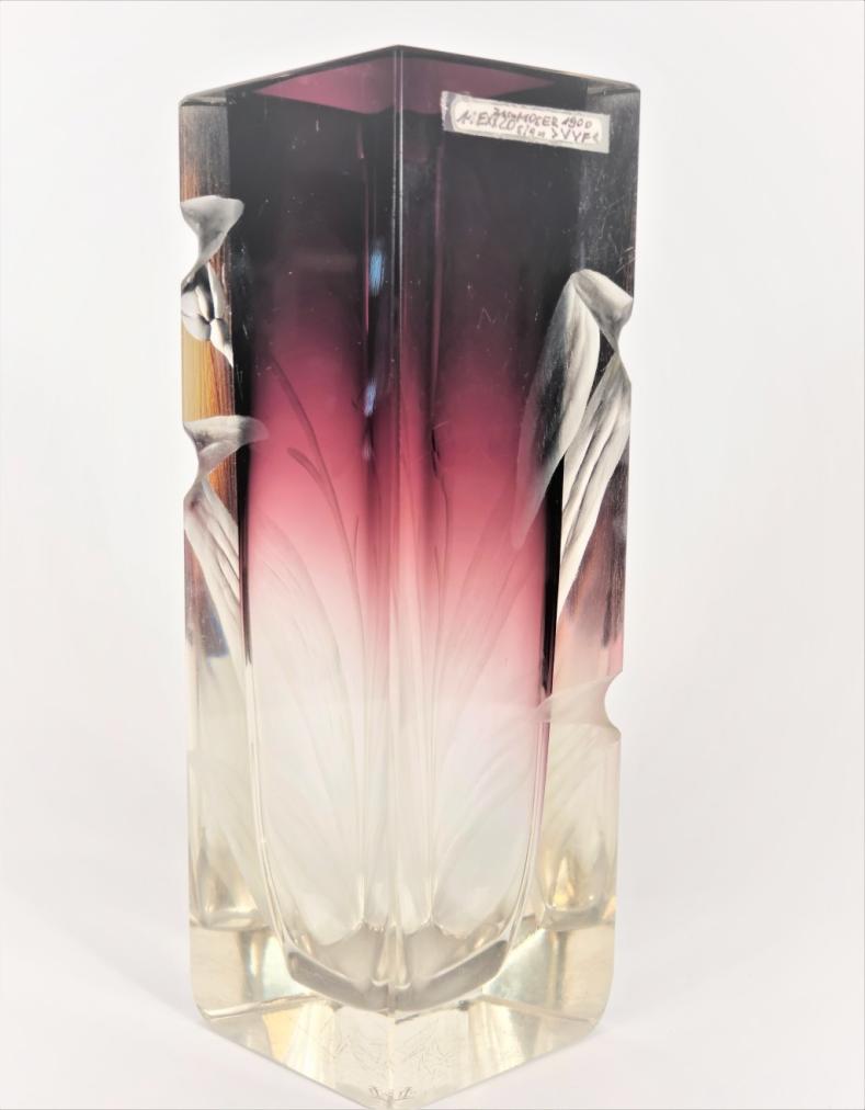 Skleněná váza o rozměrech: výška 21 cm, horní otvoru 7 x 5 cm. Rok vzniku 1900. Bez poškození.