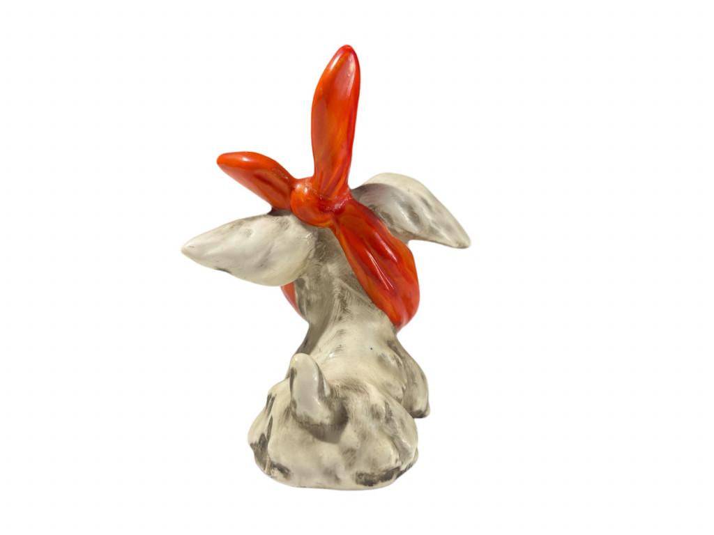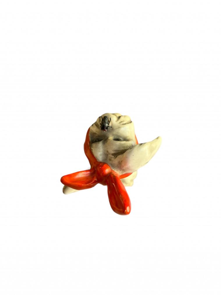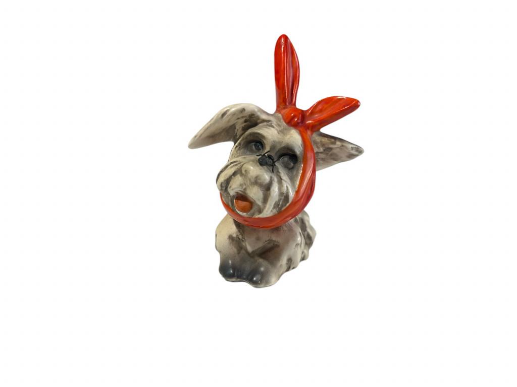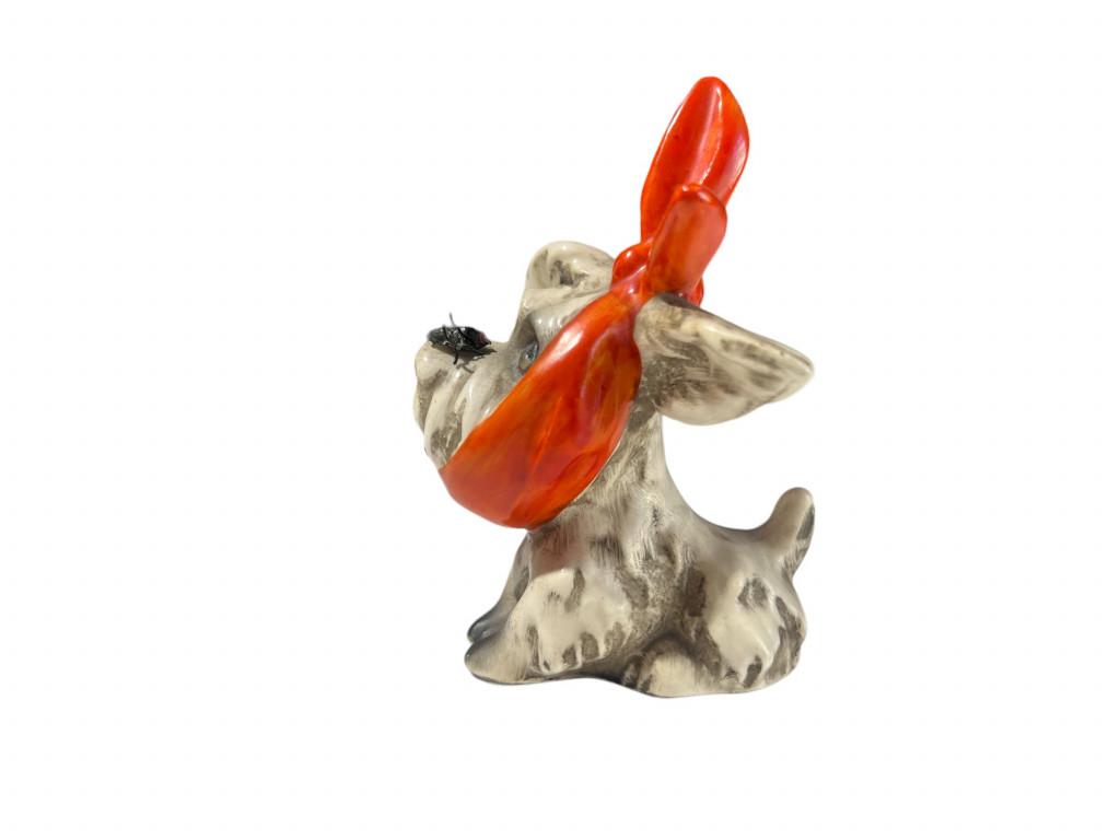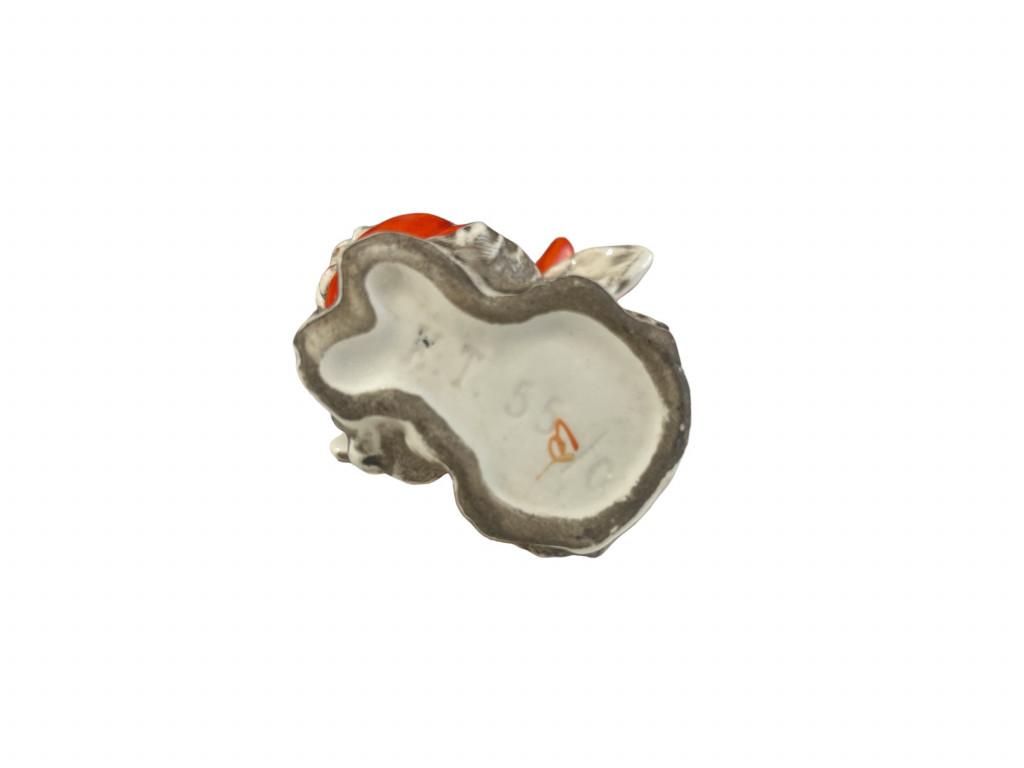 Drobná milá soška psíka s bolavým zubem a mouchou na čumáku. Rozměry 8 x 6 cm. Ze spodní strany značeno vtlačeným K.T 55 a červeným podpisem. V perfektním stavu