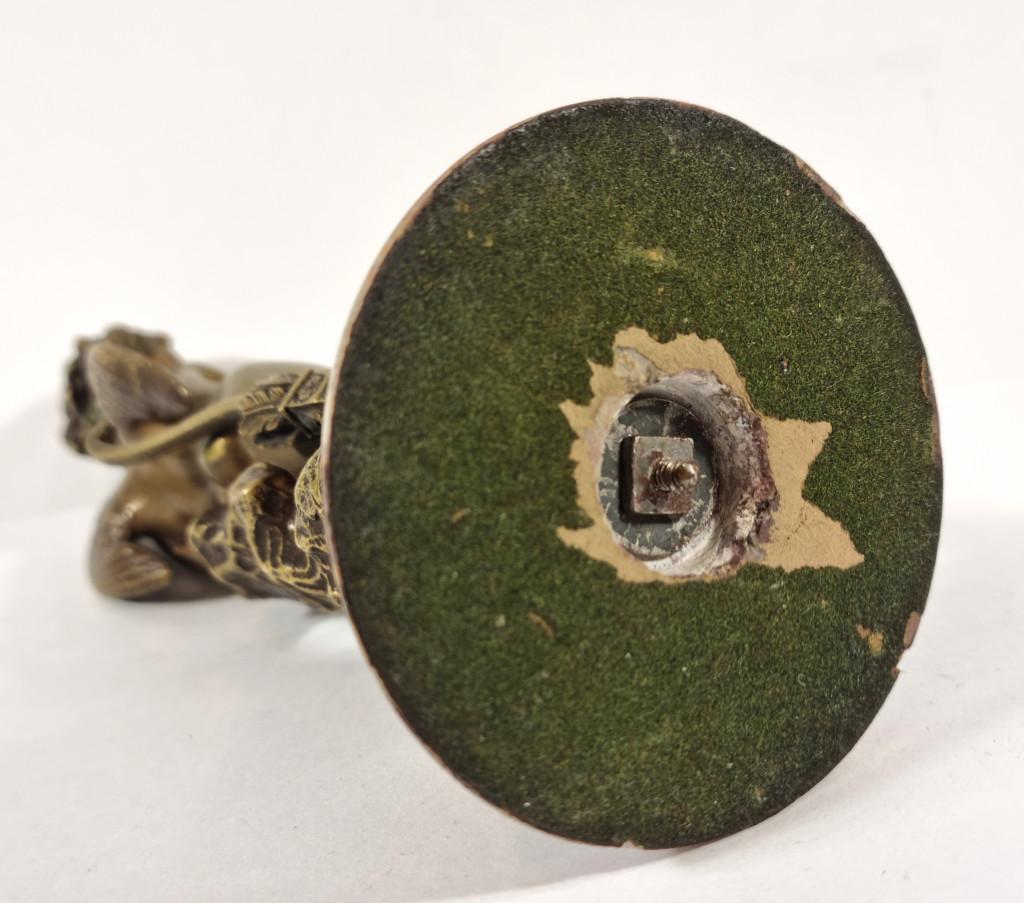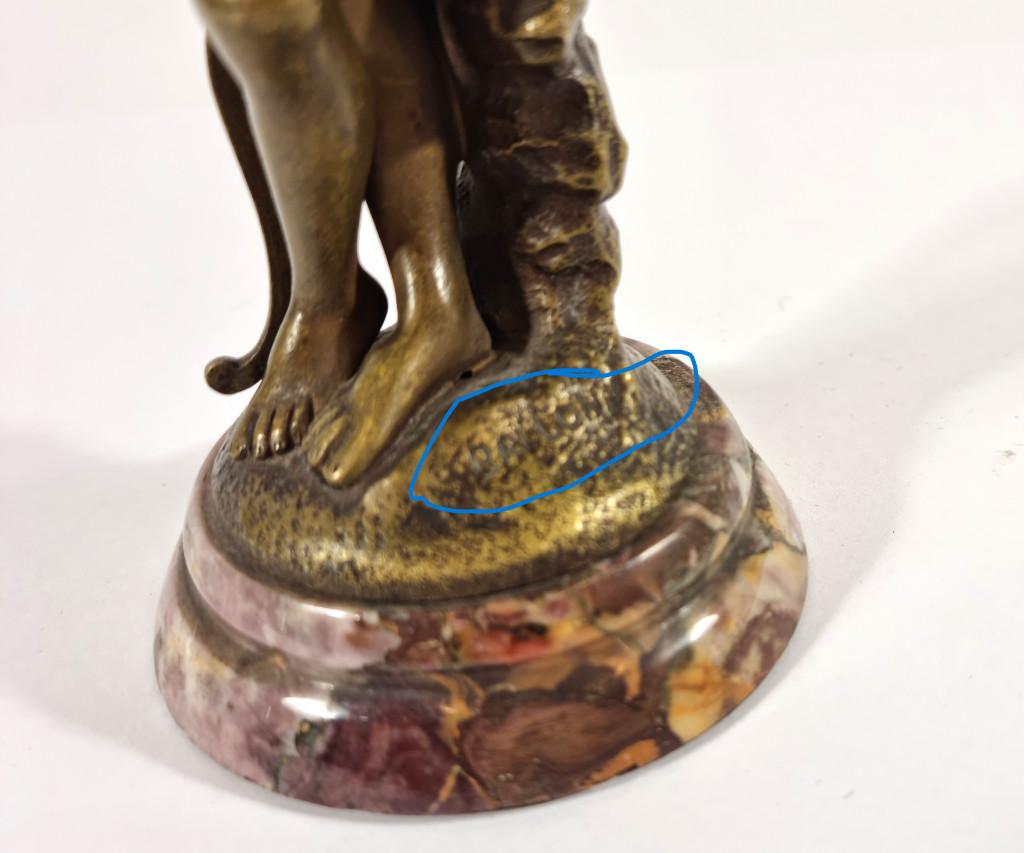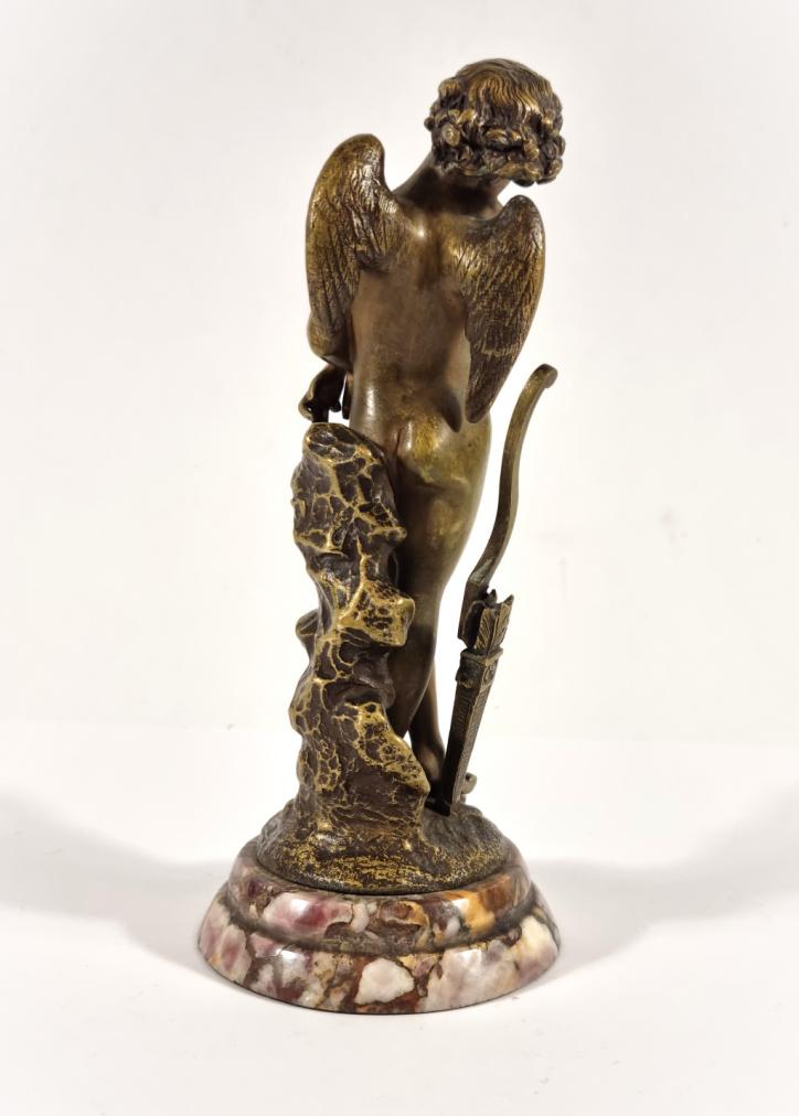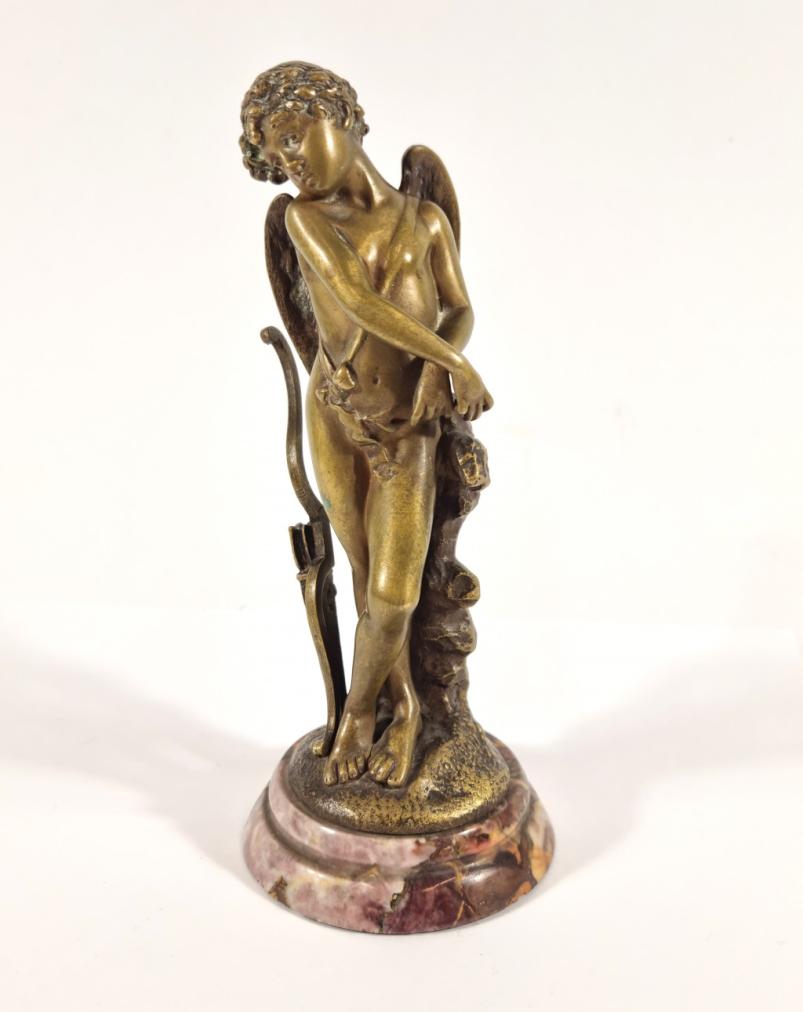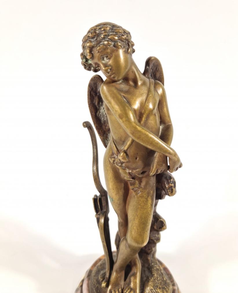 Maličká bronzová soška anděla, který cudně postává vedle svého luku s šípy. Tělo anděla je jemně zpracované, proporčně harmonické a v místech křídel, vlasů či země najdeme příjemnou patinu. Bronzová soška na mramorovém podstavci, výška celkem 17,5 cm, průměr soklíku 7,3 cm, značeno dole F."Ballon". Druhá polovina 19. století Francie.